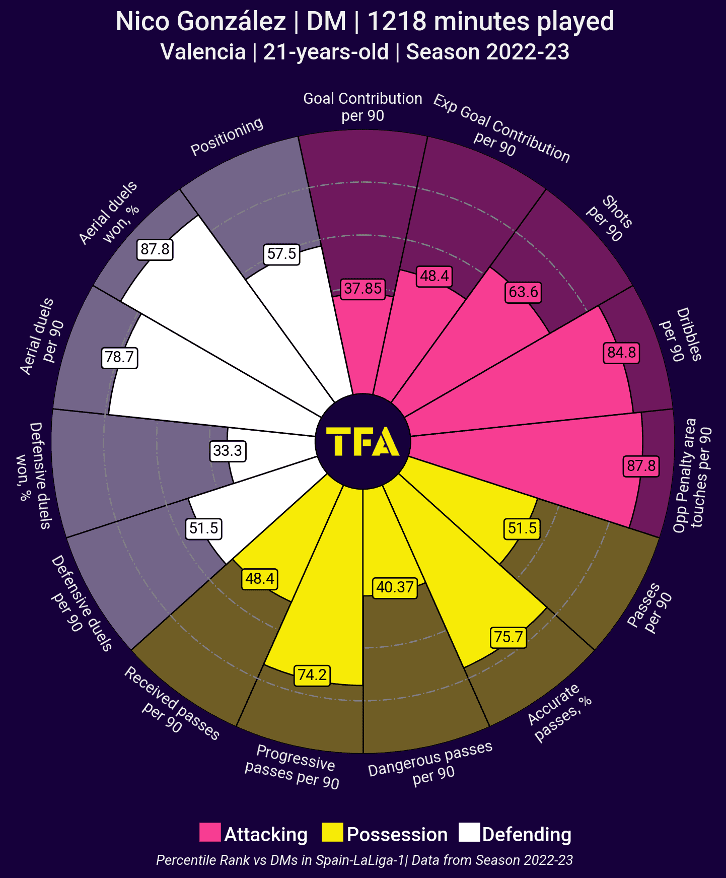 The below visualisation shows where Nico ranks for some of the attacking and defensive metrics when compared with the other defensive midfielders in the league.