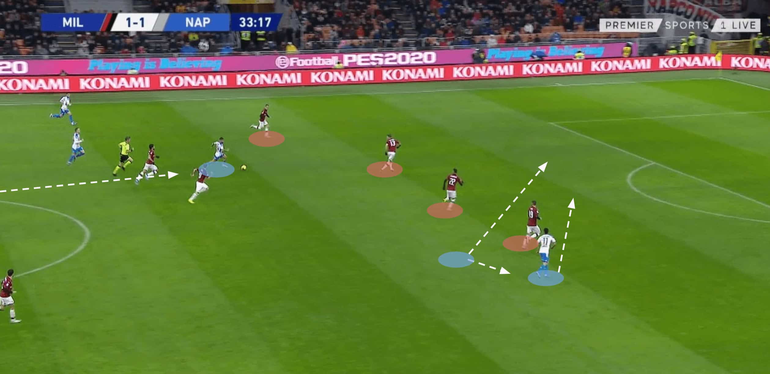 As play moves on you can see how Napoli use the overload concept in order to force the opposition into tough decisions under pressure. Laxalt opted to drop off to cover the overlapping run of Di Lorenzo. This creates the space for Lorenzo to attack, the Mexican then decided to play an early through pass to Dries Mertens on this occasion, which was blocked by Nicolas N’Koulou.
