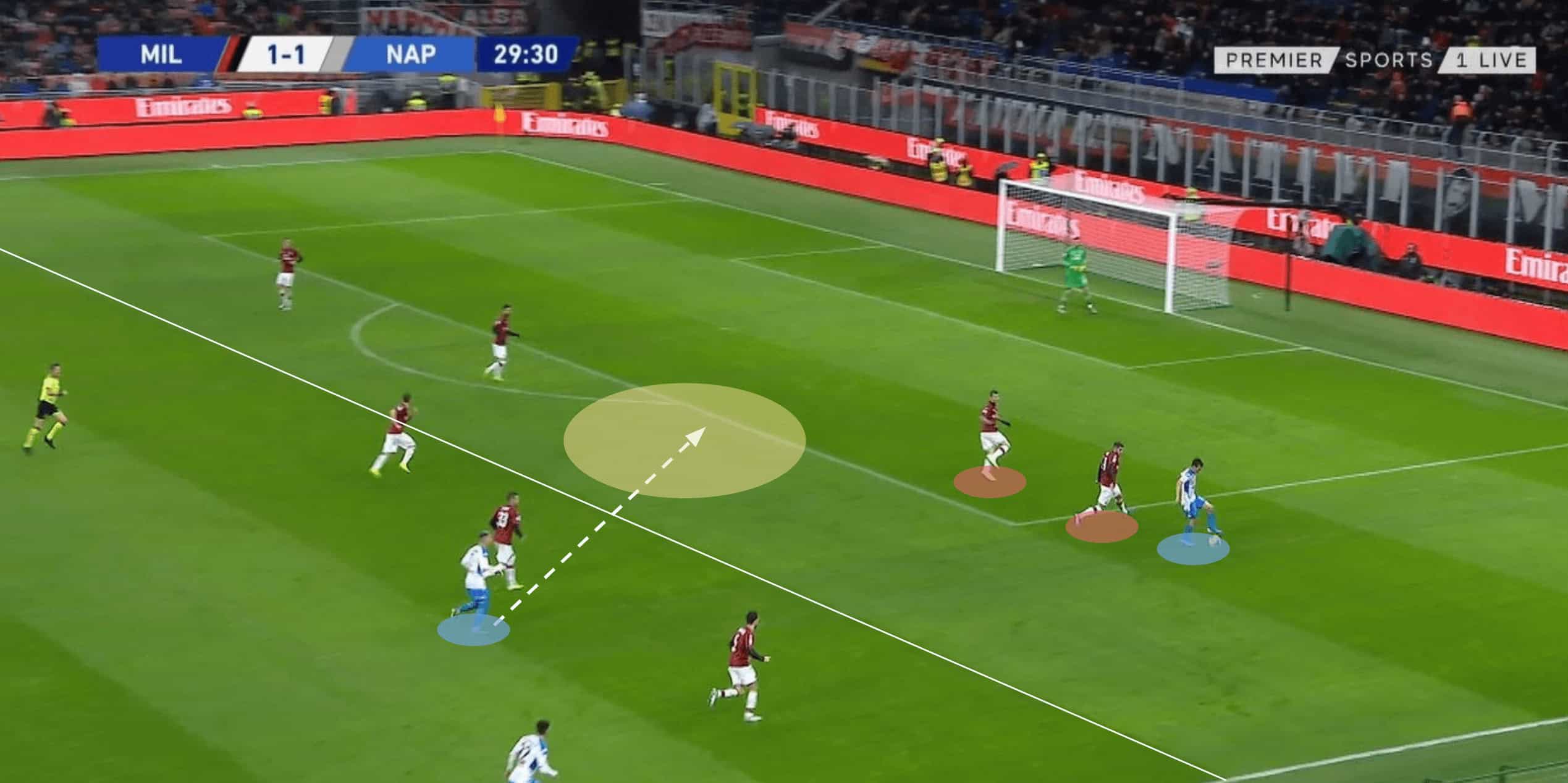Hirving Lozano is extremely dangerous when moving and accelerating into space. This gives Napoli an option to play quickly in transition when they can look to release the Mexican in wide areas. In the above image, we see this action as the ball is won back by Nikola Maksimović. Milan opting to play a direct ball in order to try and catch Napoli out of position. Maksimović plays the ball through the channel between the opposition left-back and central defender.