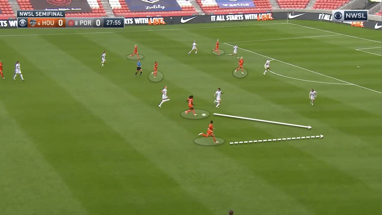 This attacking move against Portland Thorns shows us this sort of move. We can see Prince driving through the half-spaces with a rare overlapping full-back. We can see four Houston Dash players on the left side of the pitch including Groom and Mewis. This run has taken the attention of three Portland players breaking up the defence into two parts.