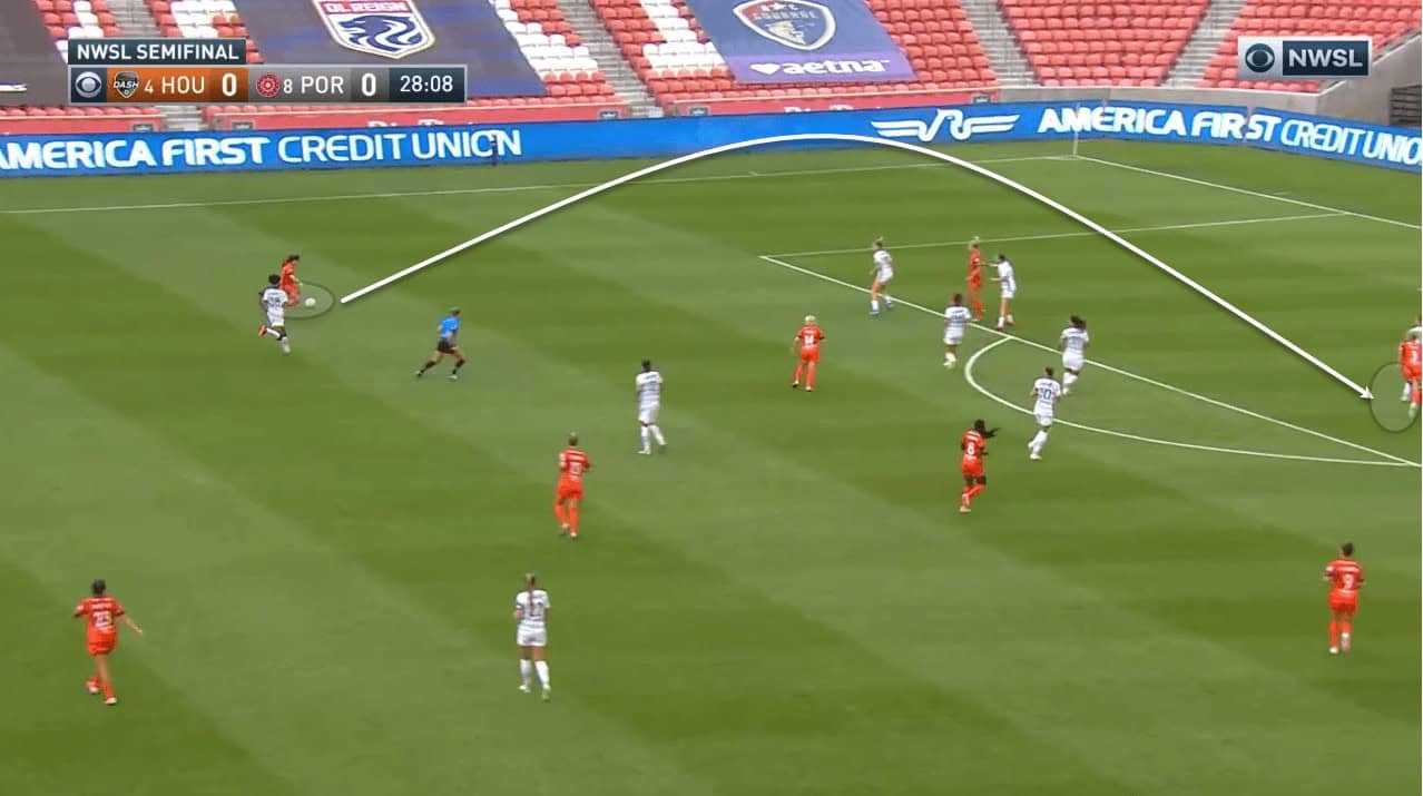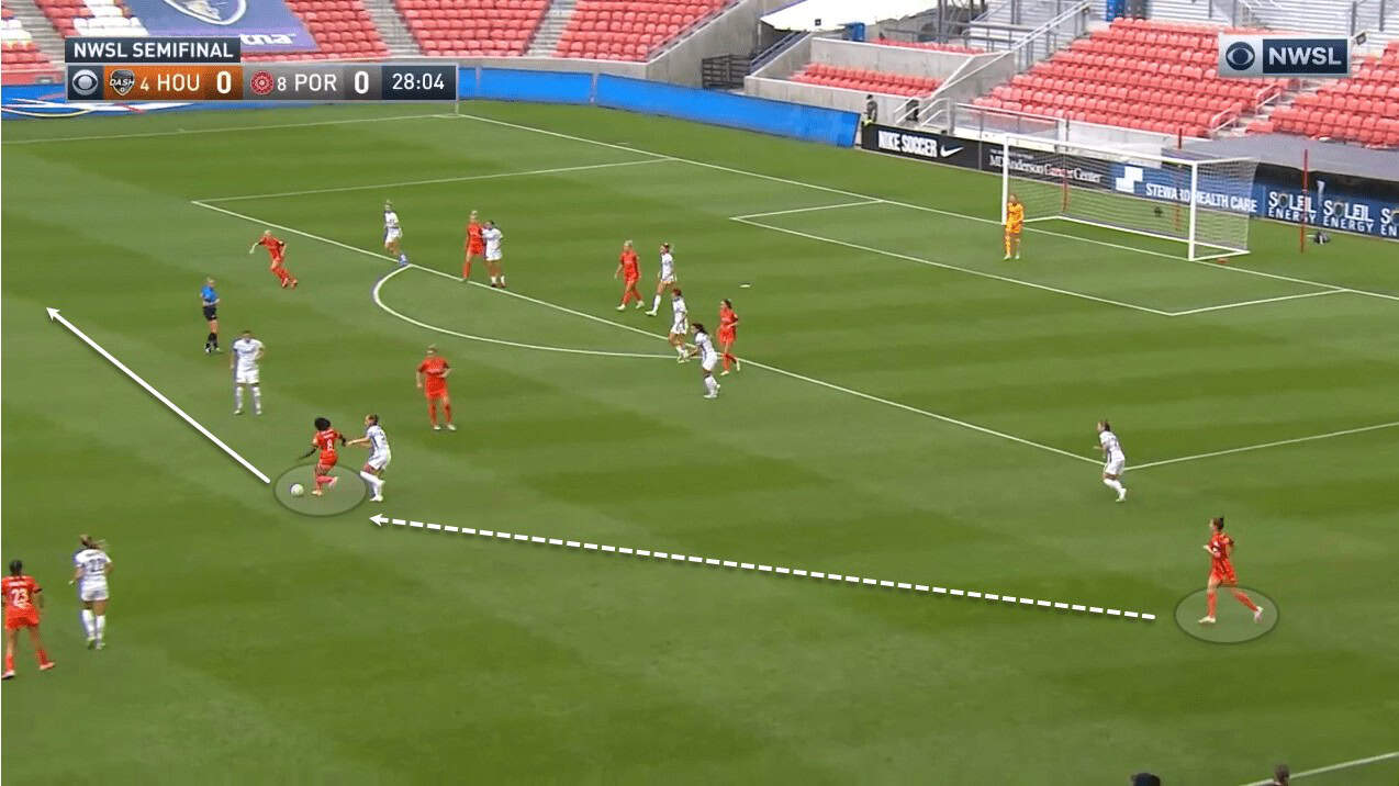 The ball is passed back to Prince who looks to switch play to the left, but what we can see already is that Houston Dash have 3-4 players in and around the box. As the ball is played out to the left, Groom and Daly make runs across to the far post thus creating a gap between Portland’s defence.