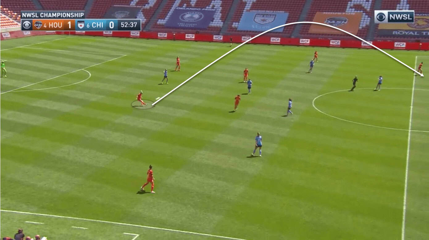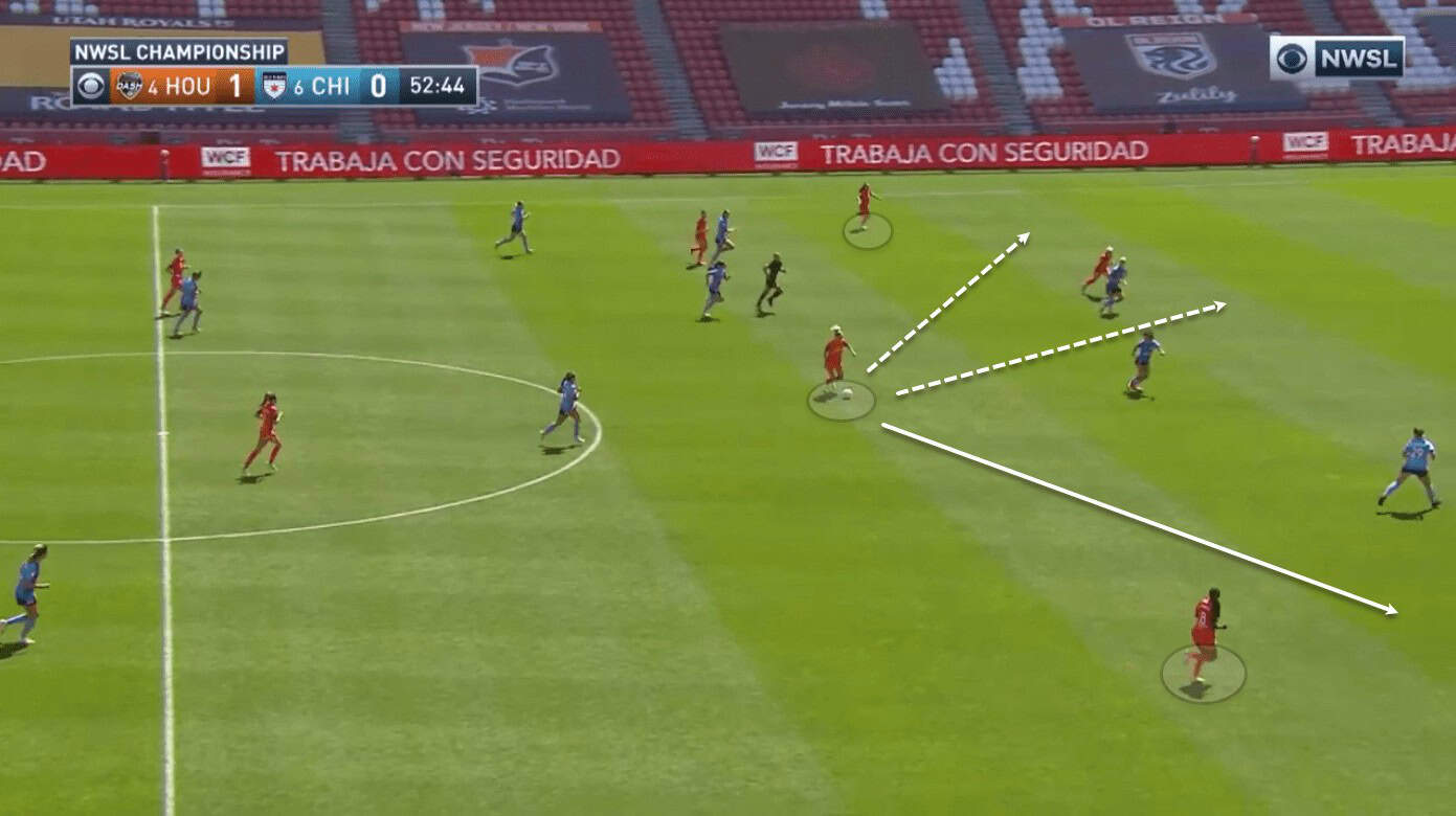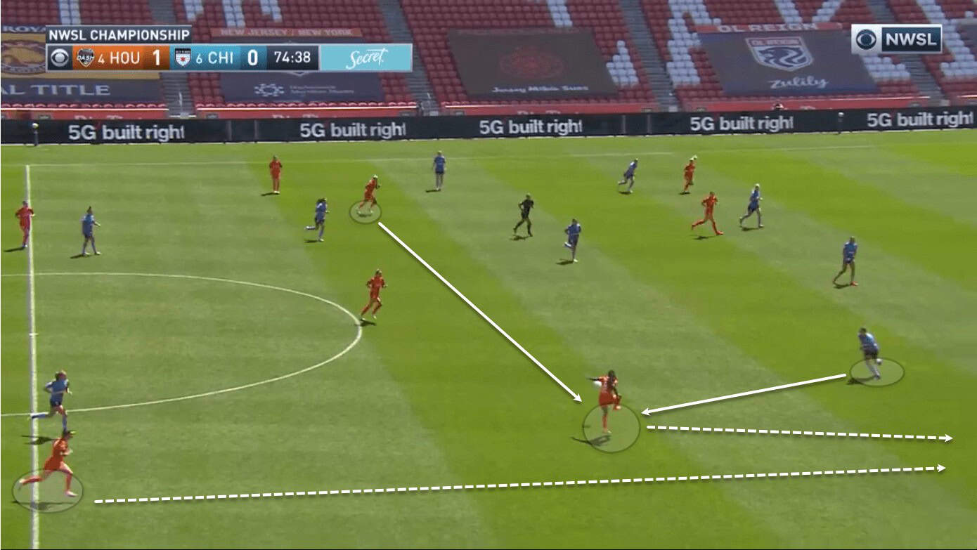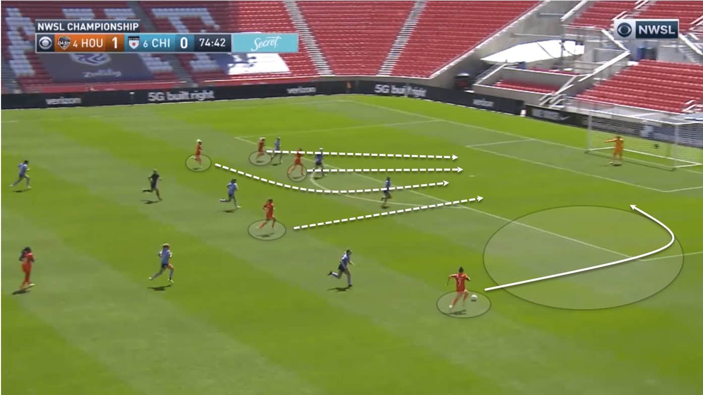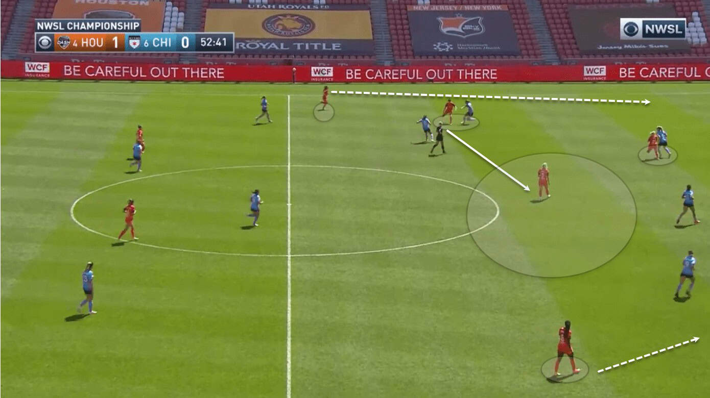 Part of the tactics here is to ensure that Dash have numerical superiority and focus on one side of the pitch to be able to switch play quickly and have enough numbers in the 18-yard box. Even though the system changes between a 4-3-3 and 4-1-4-1 within the game, the basic principle of having two players behind the centre-forward remains. When Houston Dash are in possession, they want to ensure the opposition is focused on one side by committing players across allowing the players on the opposite side to make late runs into the box. The late runs of the opposite central midfielder, wide player, and centre-forward will be in a perfect position to overload the box.