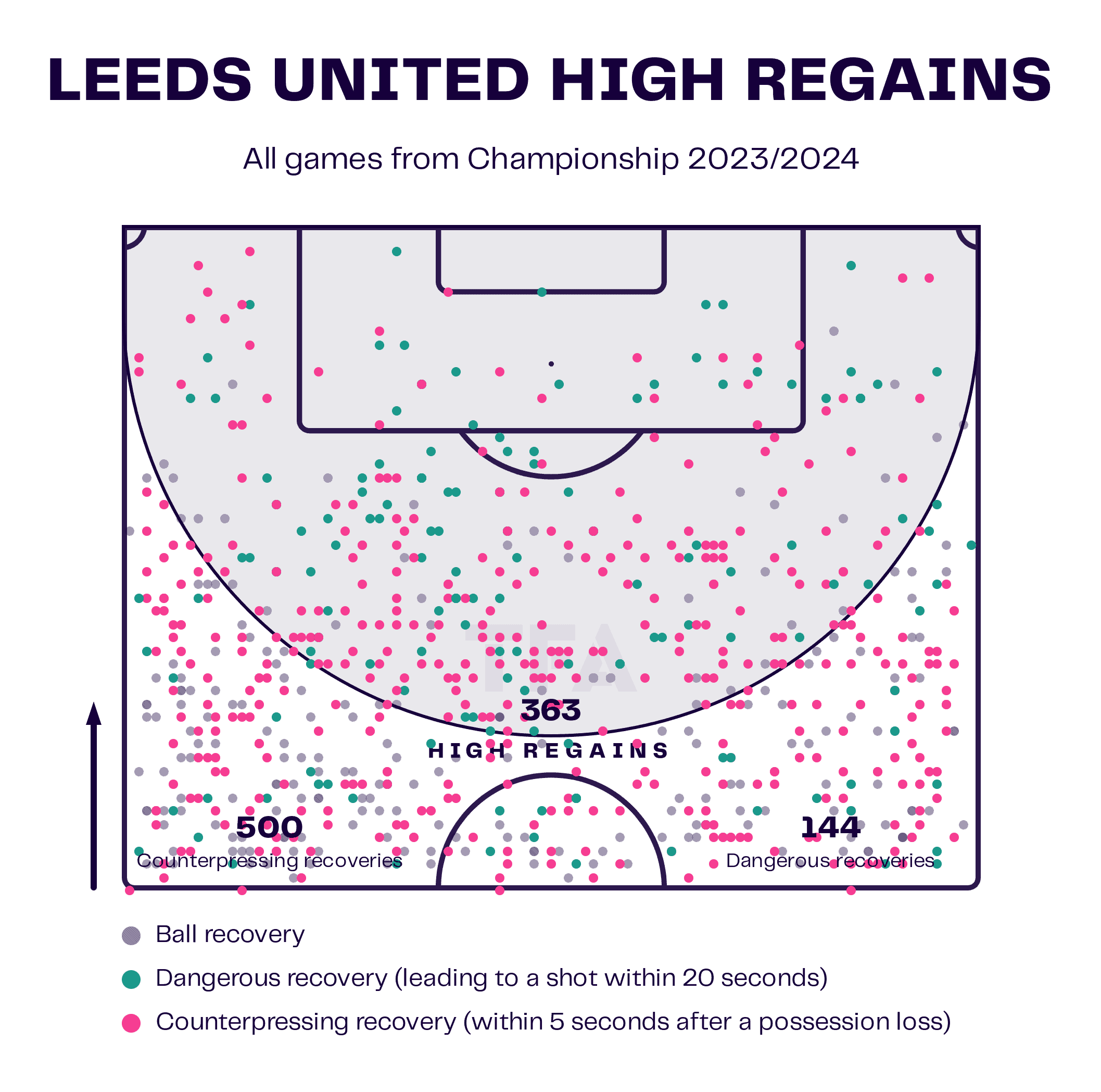The team employ a successful counter-pressing strategy, with them working actively off the ball as illustrated in their High regains map below.