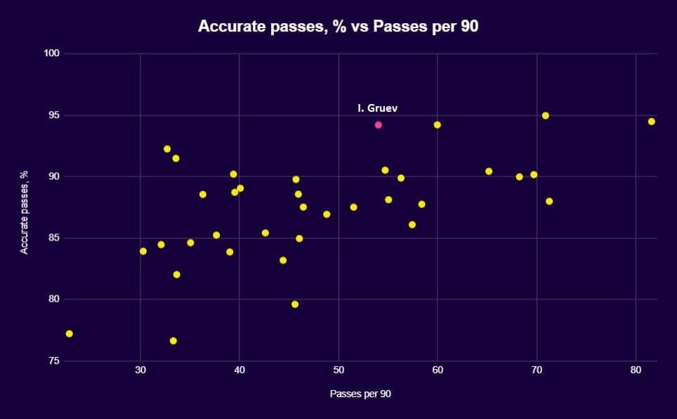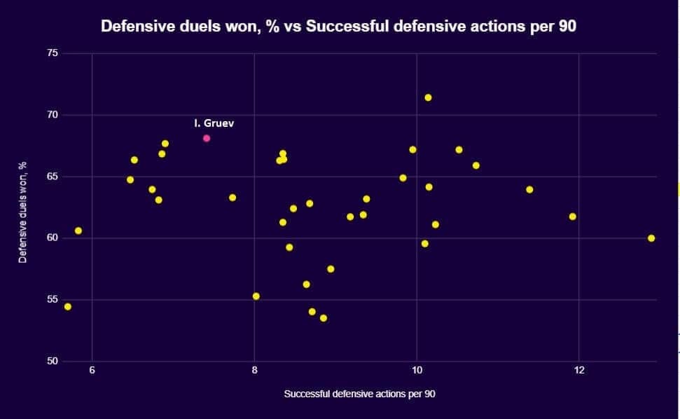 Gruev has the second-highest defensive duel success rate (68.12%). That underlines his importance during transitions, as his composure and well-timed actions provide additional support and help the team block opposition attacks early on.
