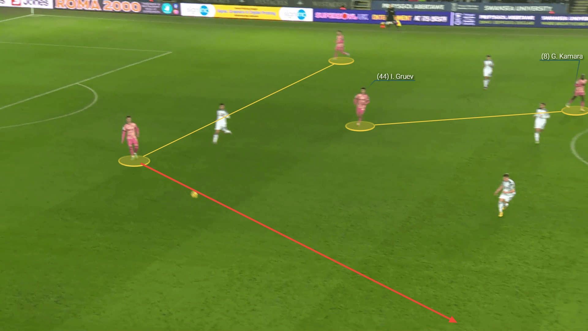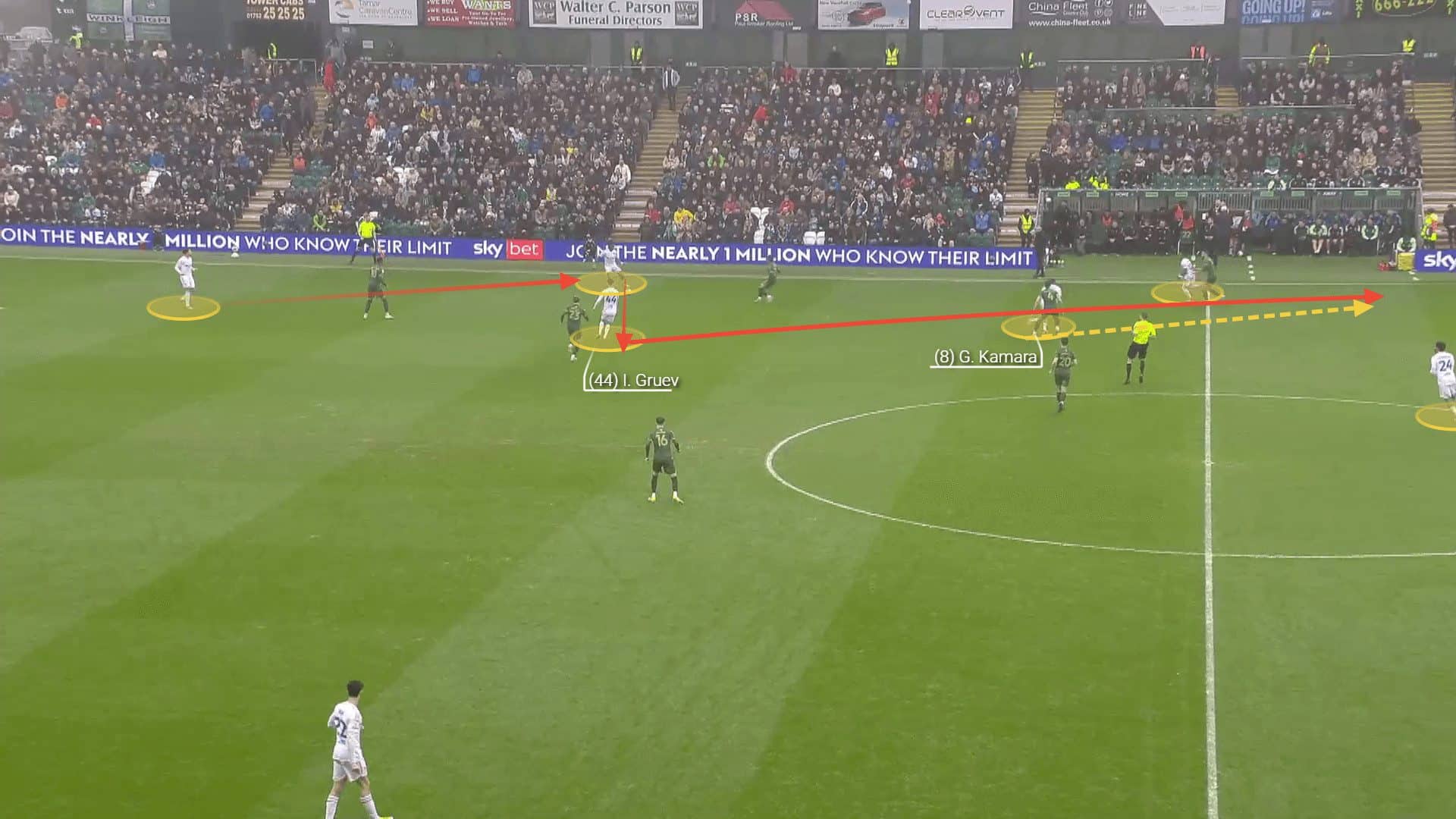 Gruev’s positioning is vital for Leeds’ successful counter-attacking actions as well, as his positional and spatial awareness allow him to receive the ball and distribute it to quality areas quickly.