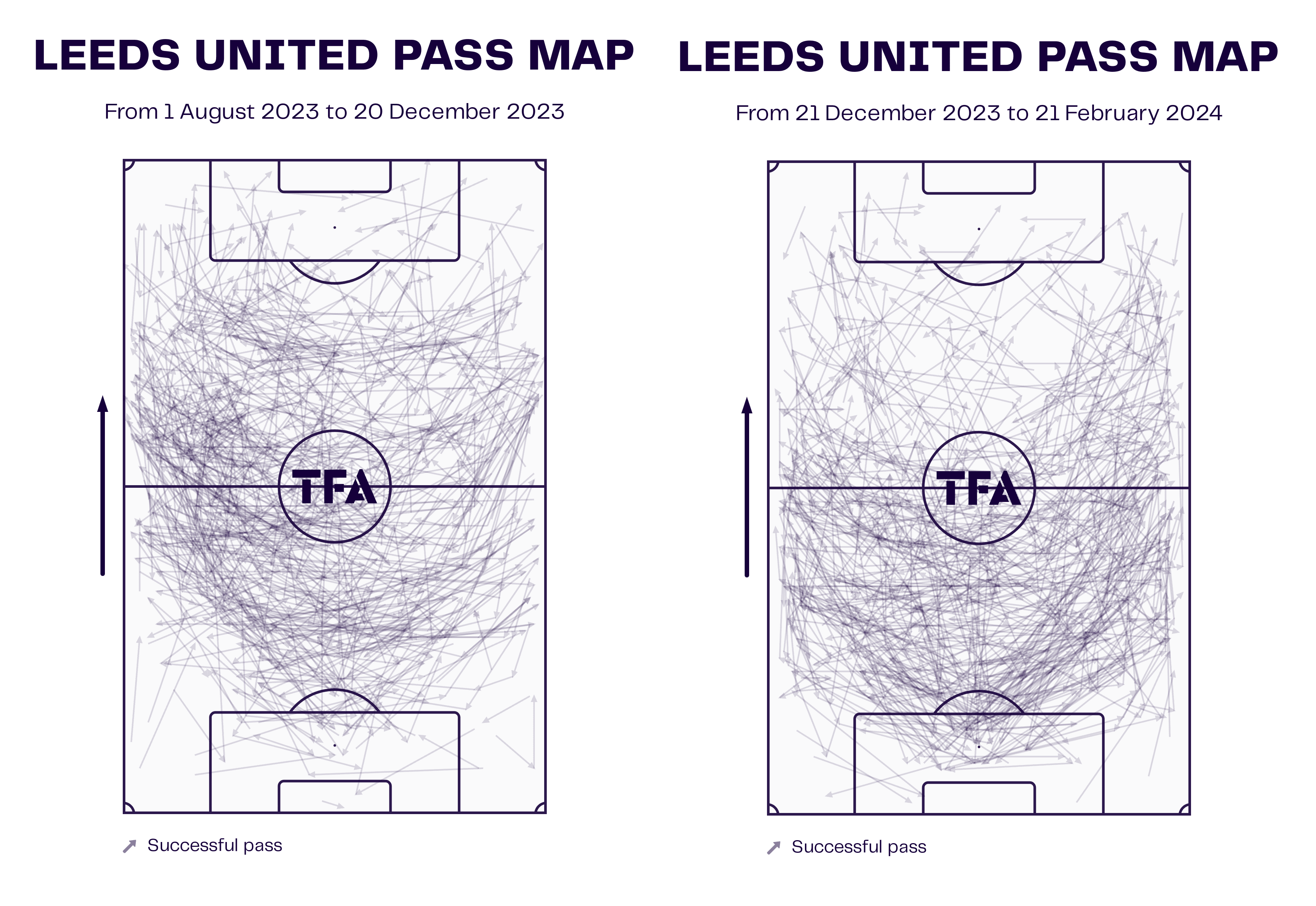 The below comparison shows Leeds’ pass map before Gruev became a regular starter and after that. Of course, the change is not only solely a result of the players’ actions but is highly affected by them.  We can see the change in shape, which shows an improved balance between both flanks and indicates that they have moved a little deeper as a unit, trying to cover their defensive areas better. That’s also the reason for the decrease in passing intensity in the advanced areas.