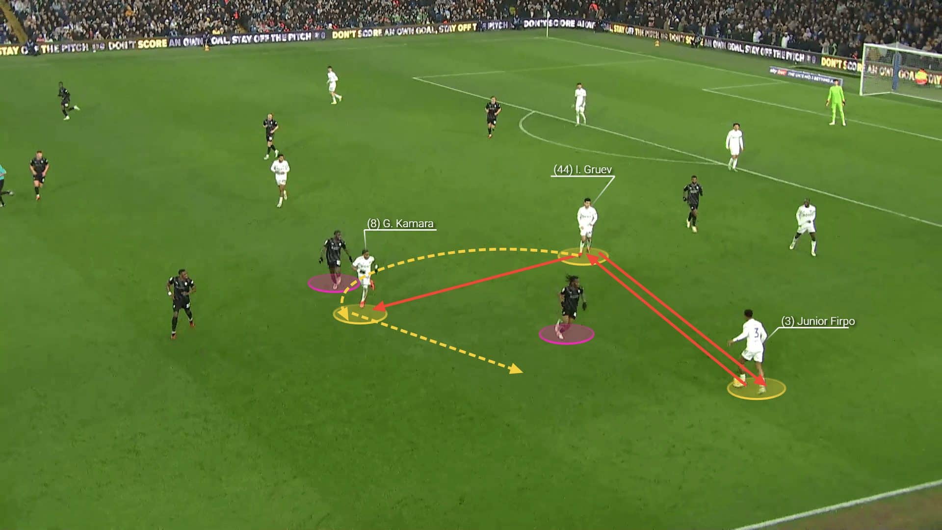 Above is an example of Leeds’ successful ball progression. Gruev, Junior Firgo and Kamara made a series of one-touch passes to bypass the press and advance the ball. Gruev’s movement here was crucial. After his one-two with Firgo, he moved into Kamara’s position to become uncovered for a split-second and receive the ball to move it forward.