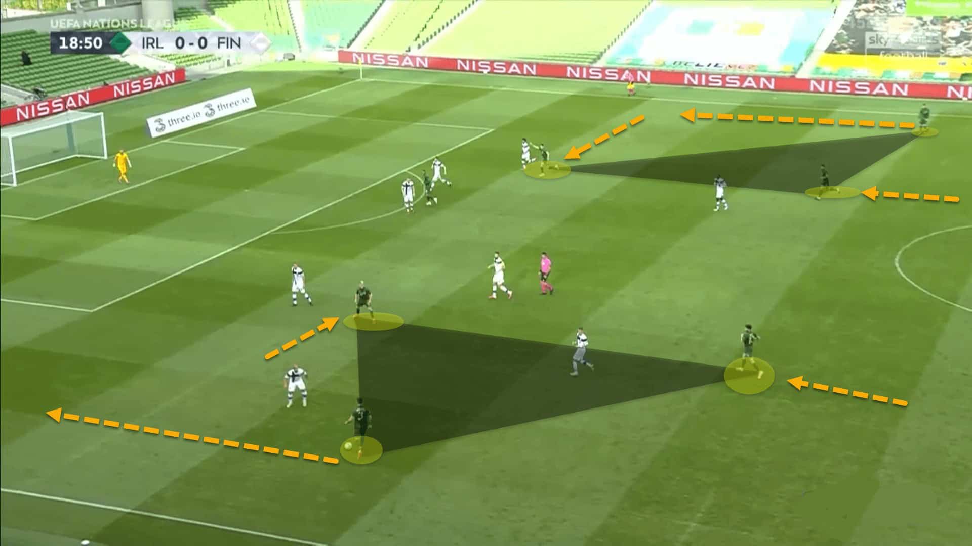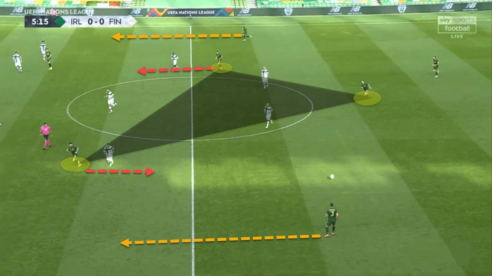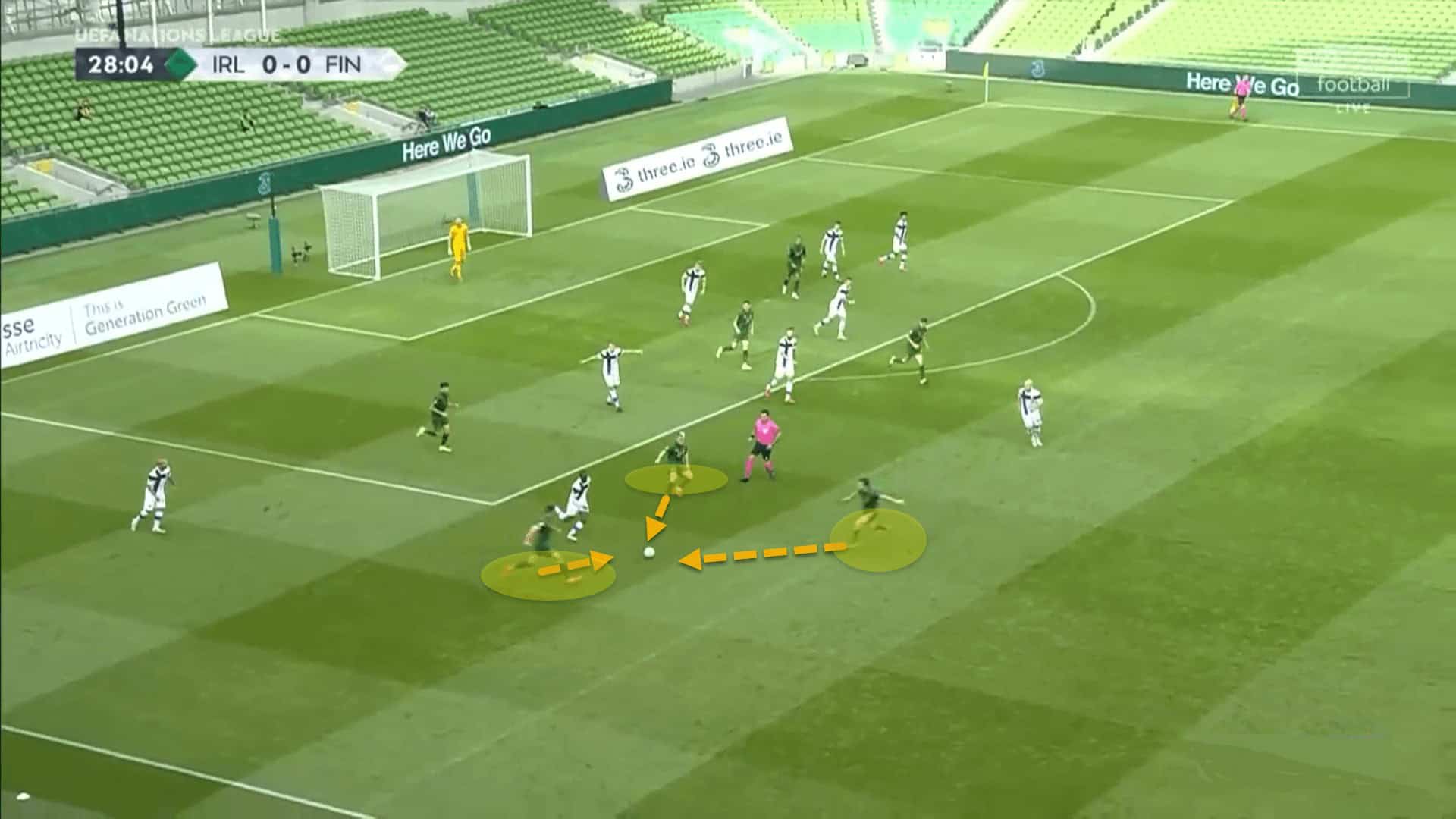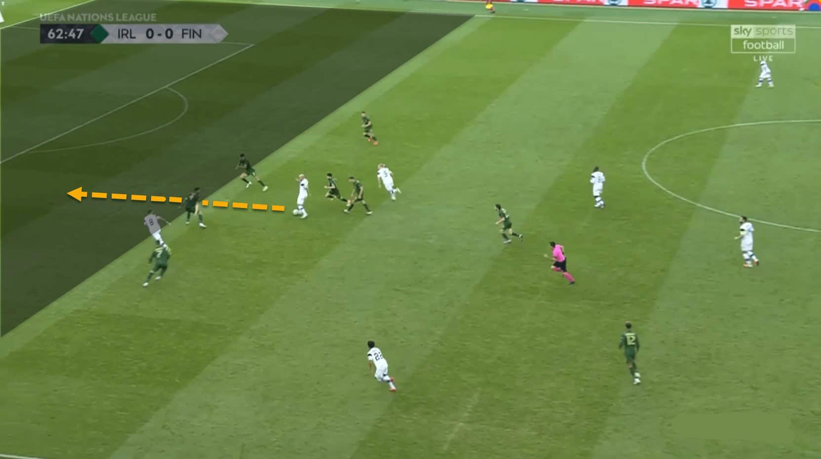 In this image we can see just that. The two centre-backs have pushed up inside the opposition’s half so as to close the gap with the rest of the Irish players. The wingers move inside and play off of the centre-forward, positioning themselves in the channel between the opposing fullback and centre-back. They drift between the halfspaces and the central corridors.