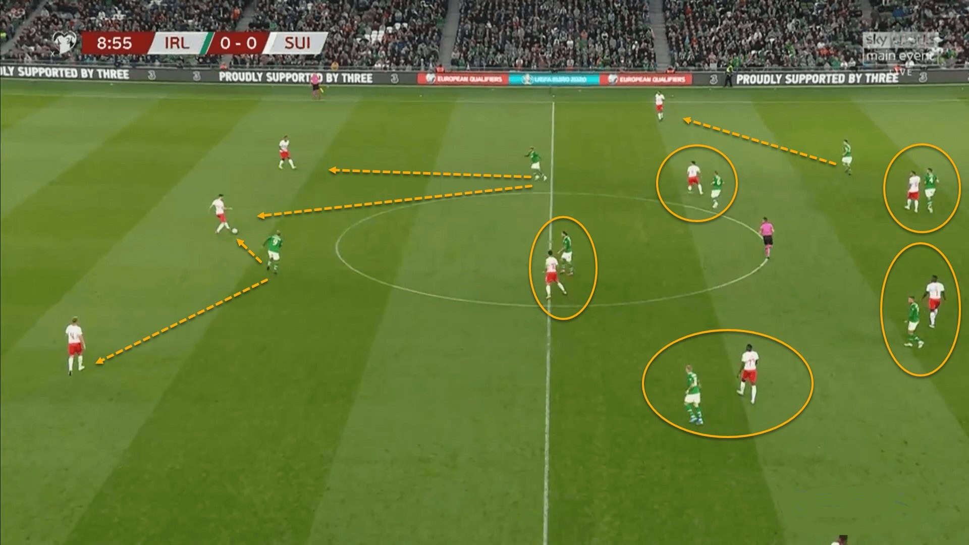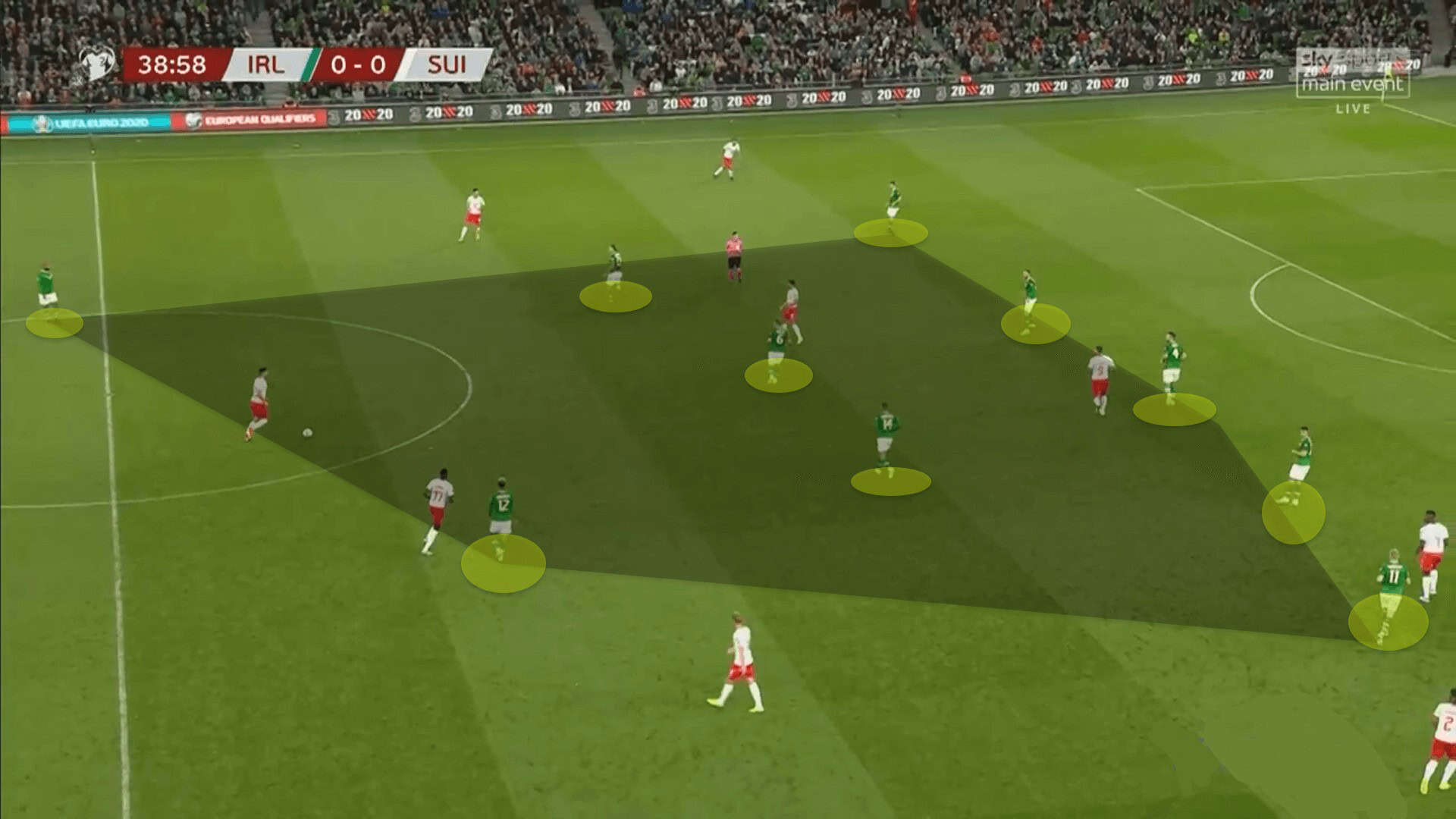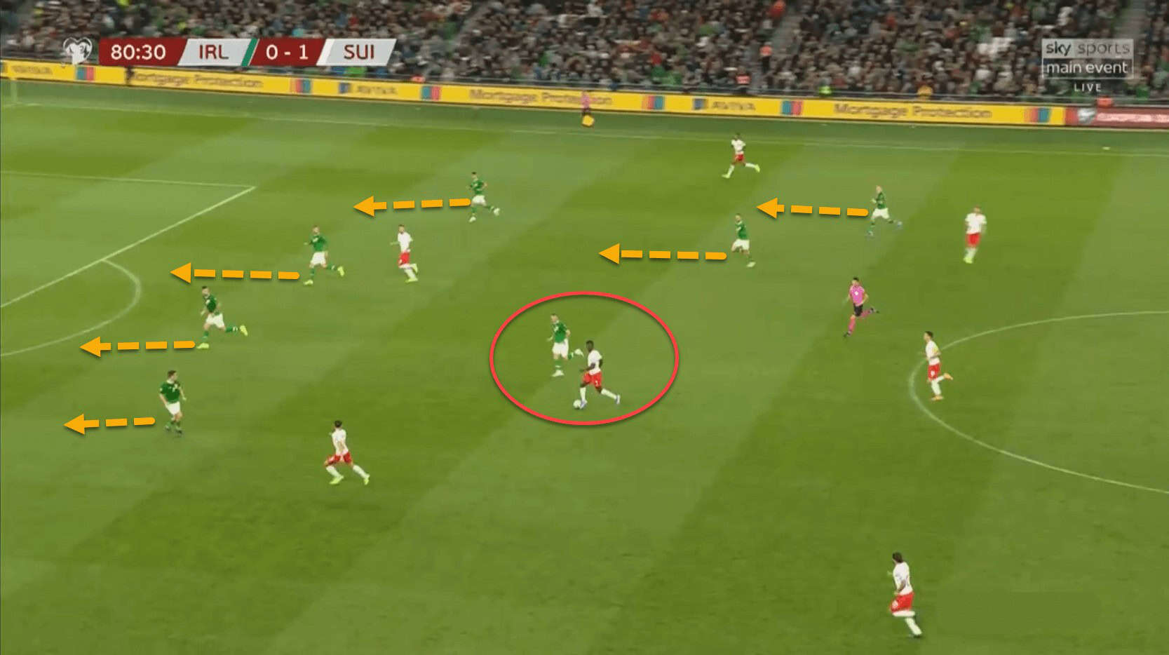 They used a man-oriented marking system during the defensive phases, which can also be seen above. In this footage, Ireland are facing Switzerland. Switzerland rotate their midfield players very often, so it was vastly important for the Irish players, especially the midfielders, to remain disciplined and focused whilst defending.