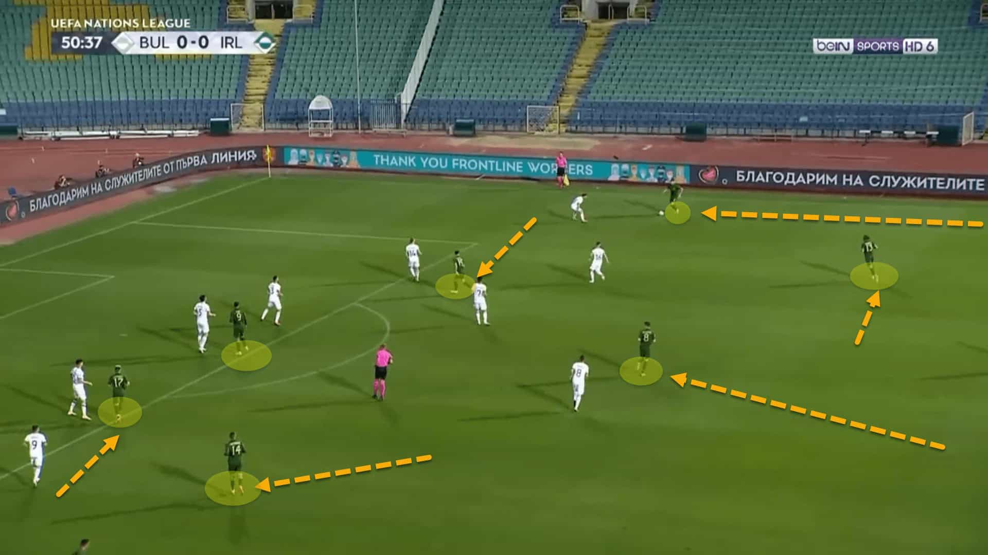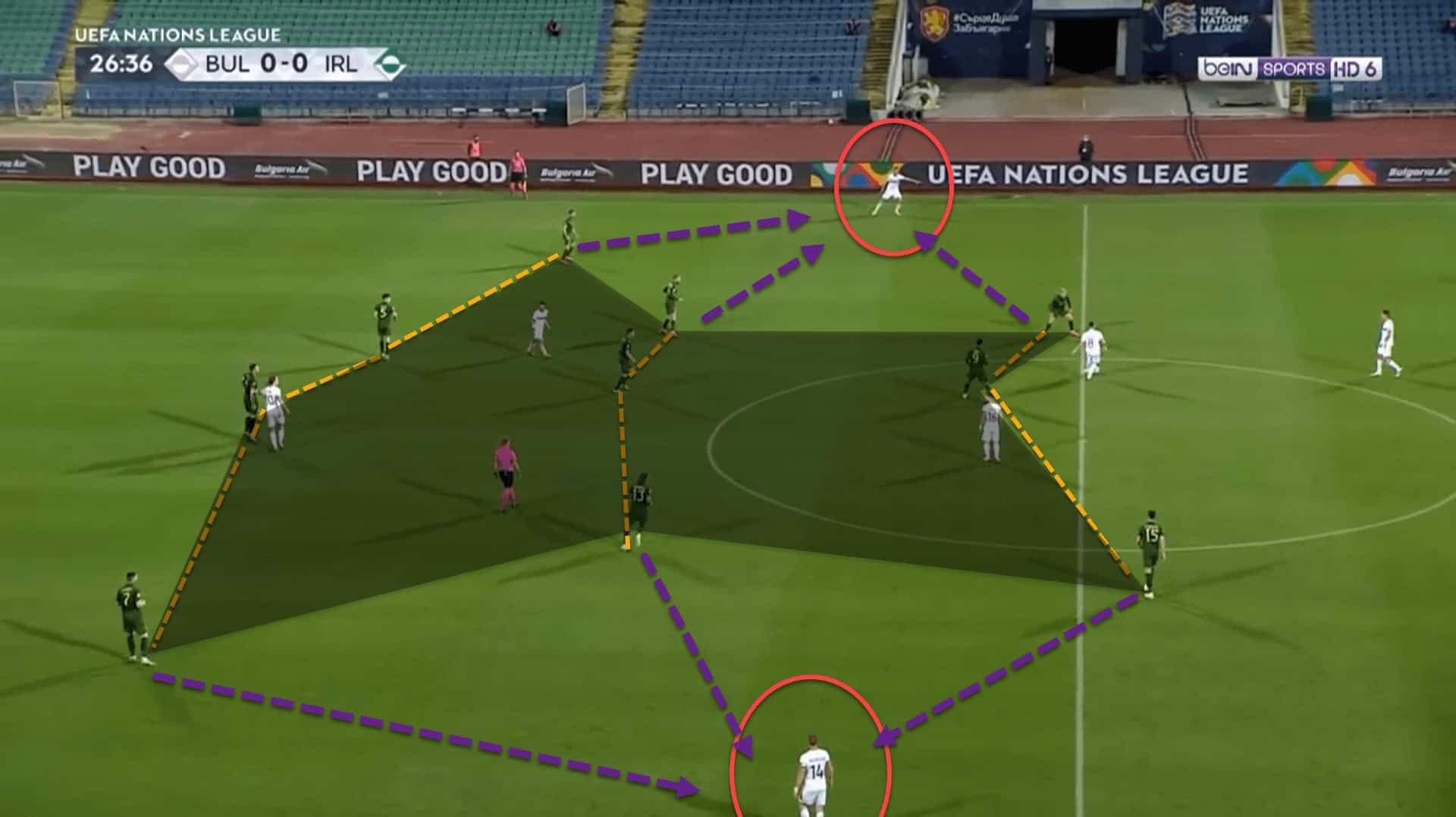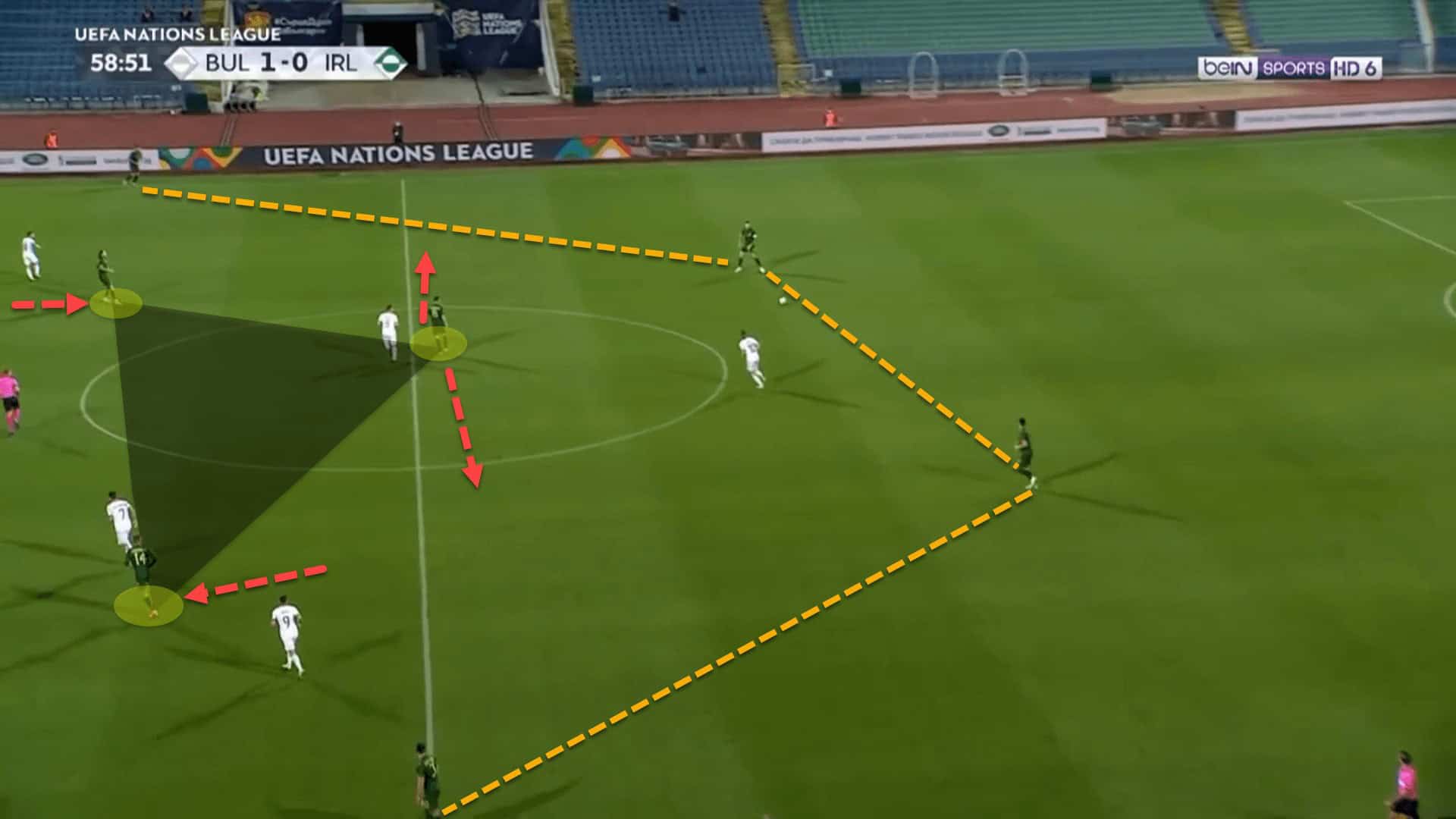 In the previous image, the left advanced midfielder is moving behind the Bulgarian midfield line, after dropping to create a triangle with the left centre-back and left-back. The right advanced midfielder is about to drop into the space in front of the Bulgarian midfield line, to create this same triangle on the right-side. These constant movements help Ireland to progress up the field quicker and more efficiently.