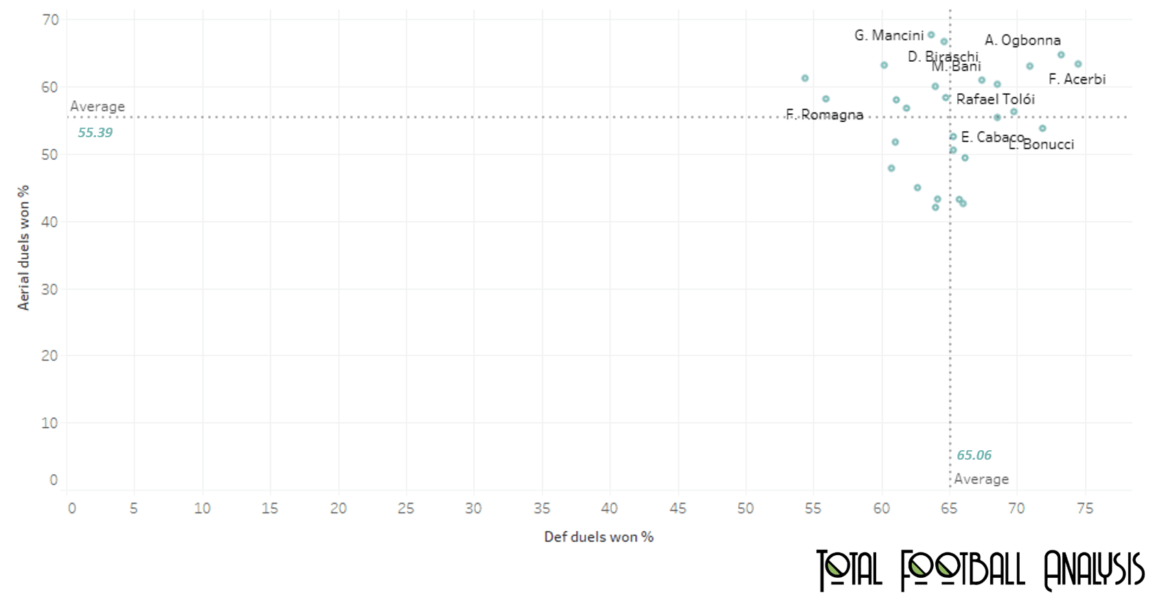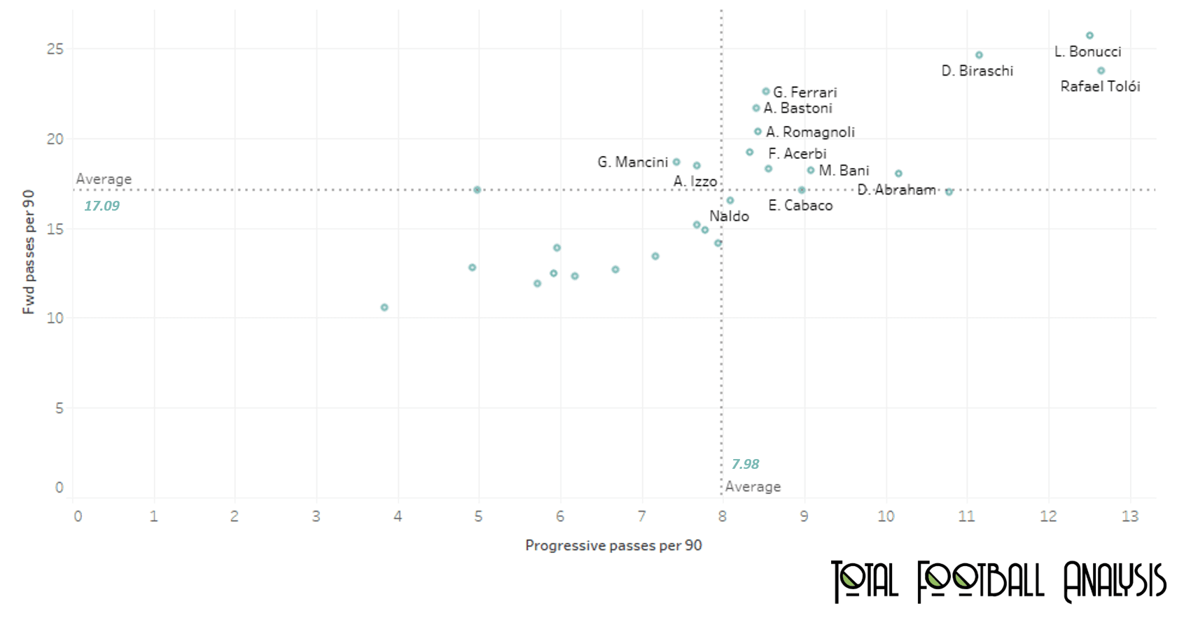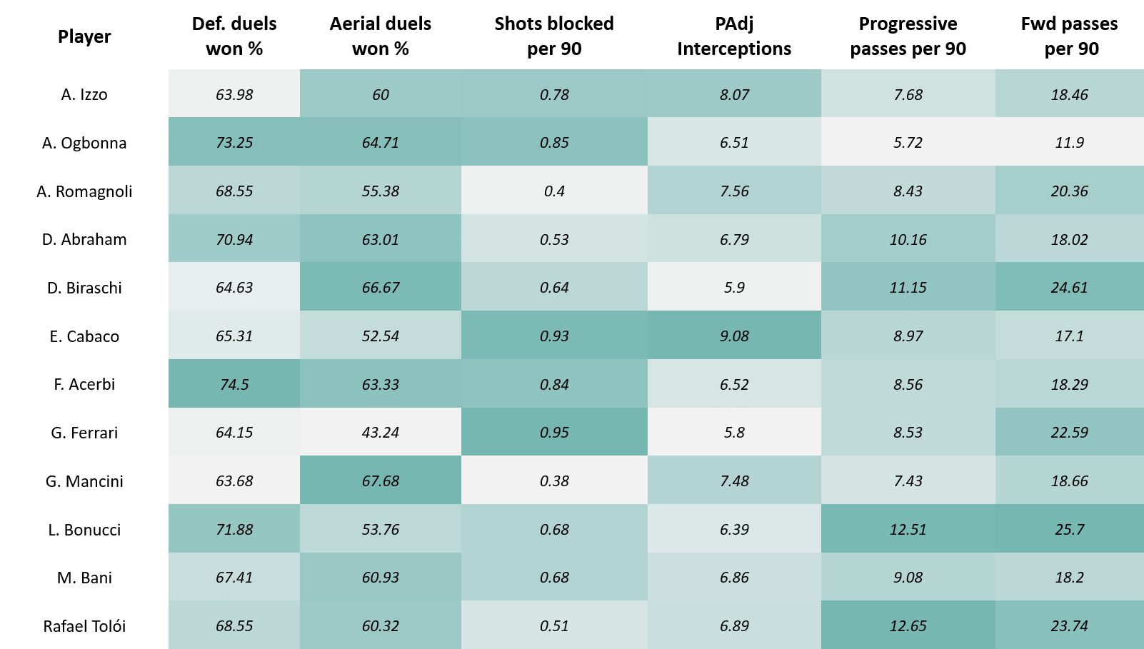 The evolved game tactics often see centre-backs play the ball out from the back, moving the ball forward and contributing to the build-up play almost like a defensive midfielder. The game requires the CB to also be able to initiate counter-attacks from the back and catch the opposition off-guard. As such a CB is required to not just be a rock in defence, but also be able to contribute with his ball-playing ability. To understand the contribution to build-up and attack play, this data analysis takes into consideration the number of forward passes played per 90, and the number of progressive passes played per 90. Progressive passes can be defined as a considerably long forward pass with – a pass length of 30m if both starting and ending points are in the same half, 15m is both points are different halves, and 10m if both points are in the opponents half. If ball progression and contribution to build-up play was the only consideration, then the statistics show that Leonardo Bonucci (33) and Rafael Tolói (29) are the top picks. Bonucci, playing for Juventus, makes 25.70 forward passes and 12.51 progressive passes per 90. Tolói, playing for Atalanta, makes 23.74 forward passes and 12.75 progressive passes per 90. Davide Biraschi (25), comes up as third choice. Biraschi, playing for Genoa, makes 24.61 forward passes and 11.15 progressive passes per 90. Gian Marco Ferrari (28) and Alessio Romagnoli come in as the next choices to add depth. These would be the choices if contribution to attacking build-up play was the only consideration.