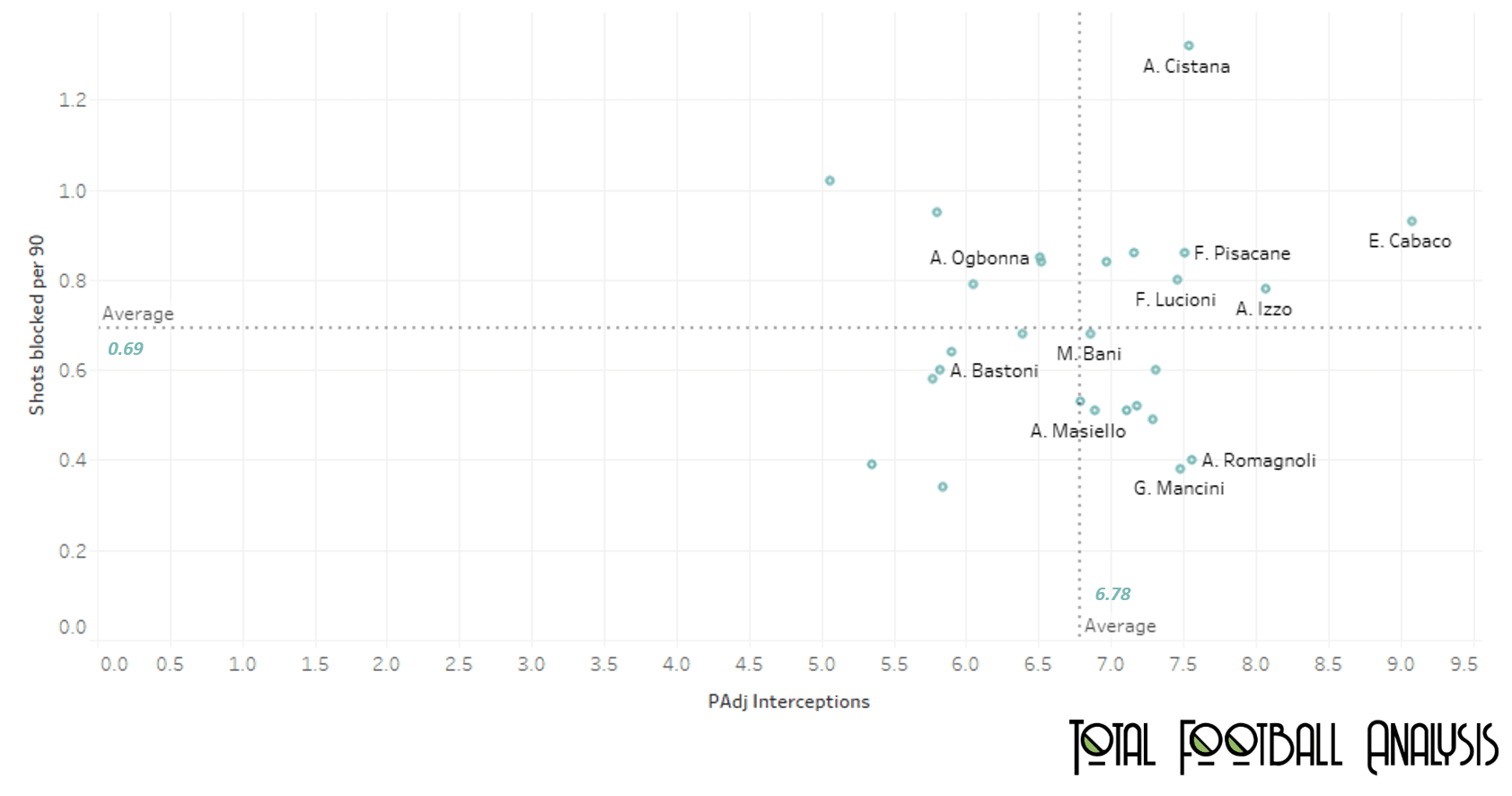 The analysis tries to further understand the players’ game, by understanding how effective they with their positioning. For this analysis, we consider possession adjusted-interceptions per 90 (PAdj Interceptions), and shots blocked per 90. Interceptions are useful in determining how good a player is at reading the game and anticipating the next move. Cutting off a passing lane by good positional awareness and intercepting a pass helps breakdown play and start a counter-attack. Shots blocked requires a combination of fine positional awareness and a willingness to put their body in the line for sake of their team. If the selection was solely basis positional awareness then the statistics show that Erick Cabaco (25) and Andrea Cistana (23) would be the best picks. Cabaco, playing for Getafe, has recorded numbers of 9.08 for PAdj interceptions and 0.93 for shots blocked per 90. Cistana, playing for Brescia, makes 7.54 PAdj interceptions and blocks 1.32 shots per 90. While there are other players such as Armando Izzo and Alessio Romagnoli who have better PAdj interceptions, they don’t do as much in terms of blocking shots. Fabio Pisacane (34) does well on both counts, but at 34 it seems highly unlikely that he’s going to get a call-up. Pisacane’s drop means Izzo and/or Romagnoli can be the next choices to add depth. Again, the picks are based on if positional awareness is the only attribute considered.