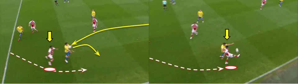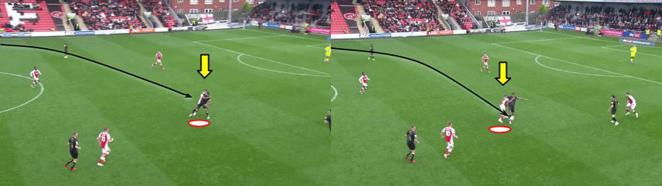 Here, we can see a sequence in which a rival controls the ball wide and Hill is behind him but doesn’t engage in the duel. As the touch isn’t perfect and Hill has a good angle, he manages to get to the ball before the rival and recover it.