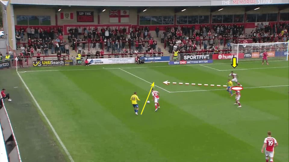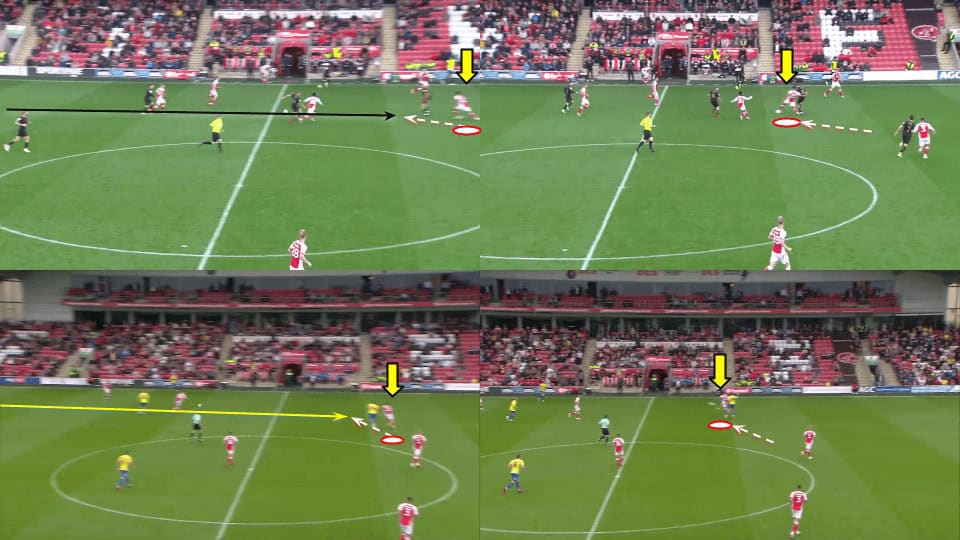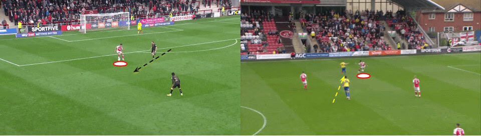 On the ball, Hill is calm and has good technique. He manipulates the ball very well to create passing lanes and makes good decisions, not rushing into passes and looking very composed under pressure. He’s usually the man in charge of Fleetwood Town’s build-up, getting a lot in central positions to form a back-three and launch his passes from there.