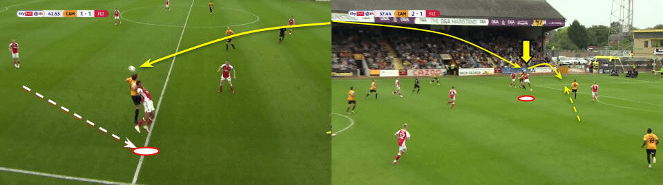 A big and quite overlooked part of Hill’s contribution in attack is his long throw-ins. He takes them for Fleetwood Town from both flanks and can reach the far post and create chances. In the map below, we see all his throw-ins that reached the box this season. He can reach the box from the middle third easily, which is a great shortcut for his team to create chances.