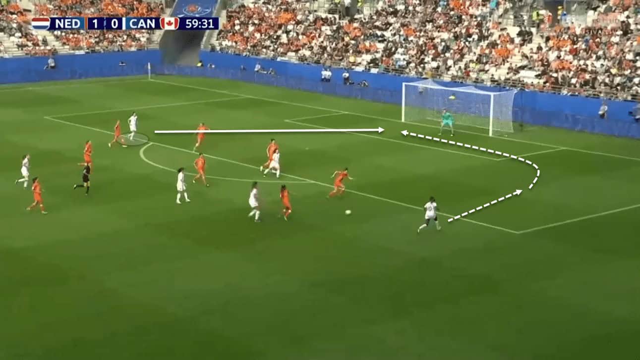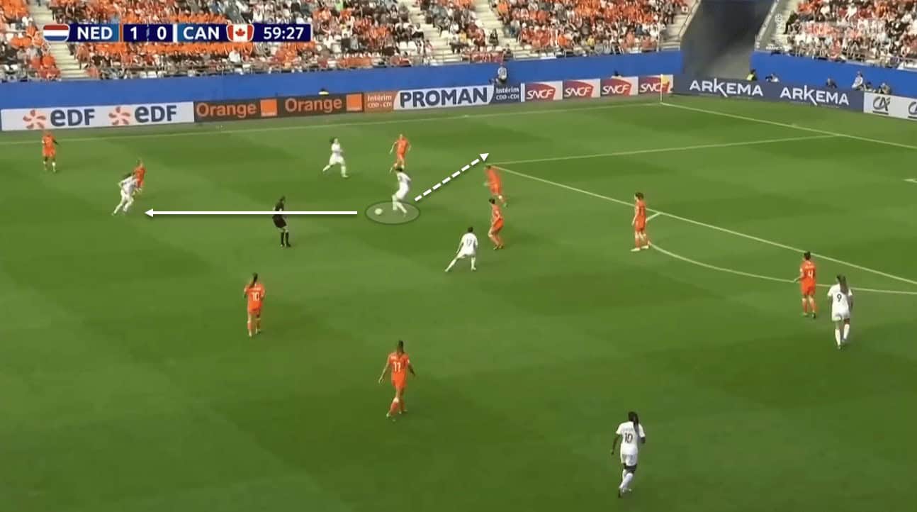 Taking this example from the 2019 Women’s World Cup, Canada are attacking the Netherlands who are defensively organised in the image above. Sinclair drops into a pocket of space to bounce a pass and moves into the left channel.