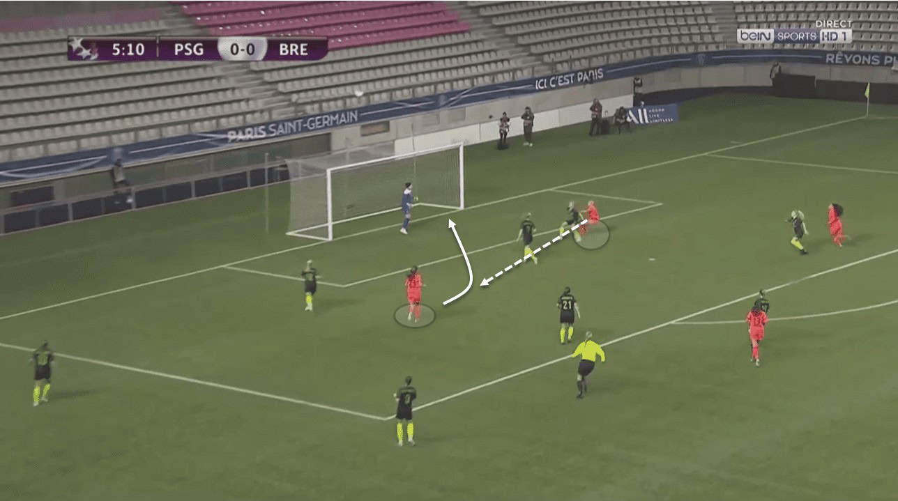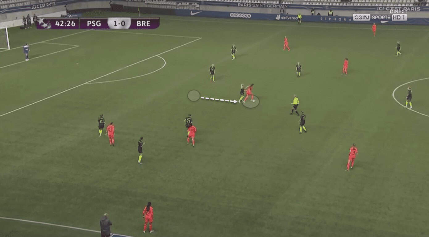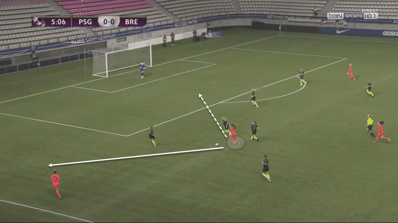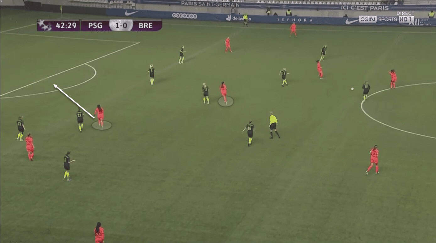 The still image above is from a UEFA Women’s Champions League game against Briedablik where Huitema started as the centre-forward. During PSG’s build-up, Huitema drops into the hole as the ball reaches the central midfielders. Briedablik held a compact shape and man marked the attacking players. Huitema’s deeper position has brought out the centre-back from her position which means this is an opportunity to exploit.