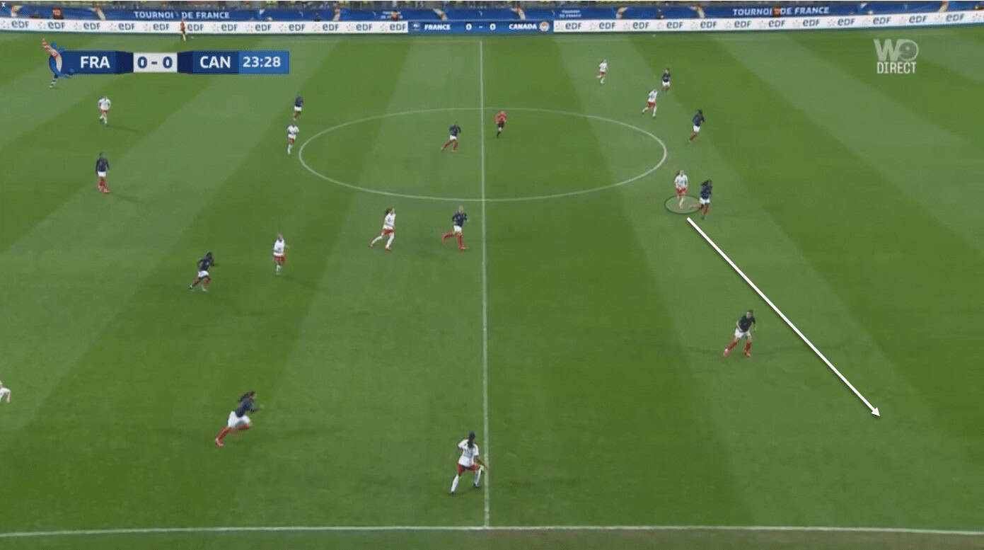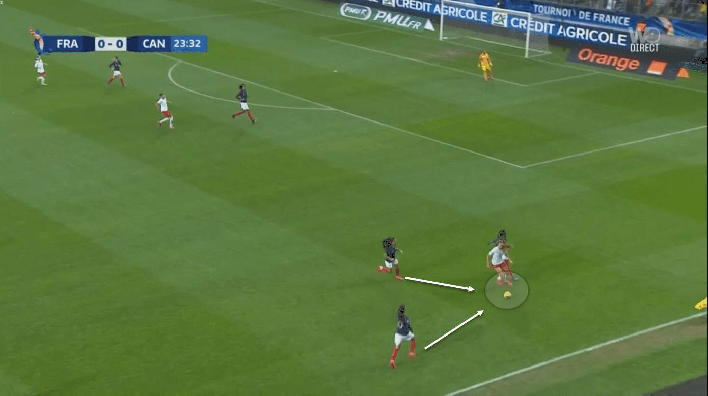 Here we can see the ball reaches Huitema in the wide right channel where she is now surrounded by three French players. However, what’s important to take away from here is the ample amount of space in behind the three French players. The Canadian full-back, who made the initial pass, could drive into the interior channel and be a potential passing option for Huitema. Though there is a chance she’ll get dispossessed here, Huitema’s ability to engage and occupy up to three players is impressive. The two Canadian attackers are now in favourable 1 v 1 battles.