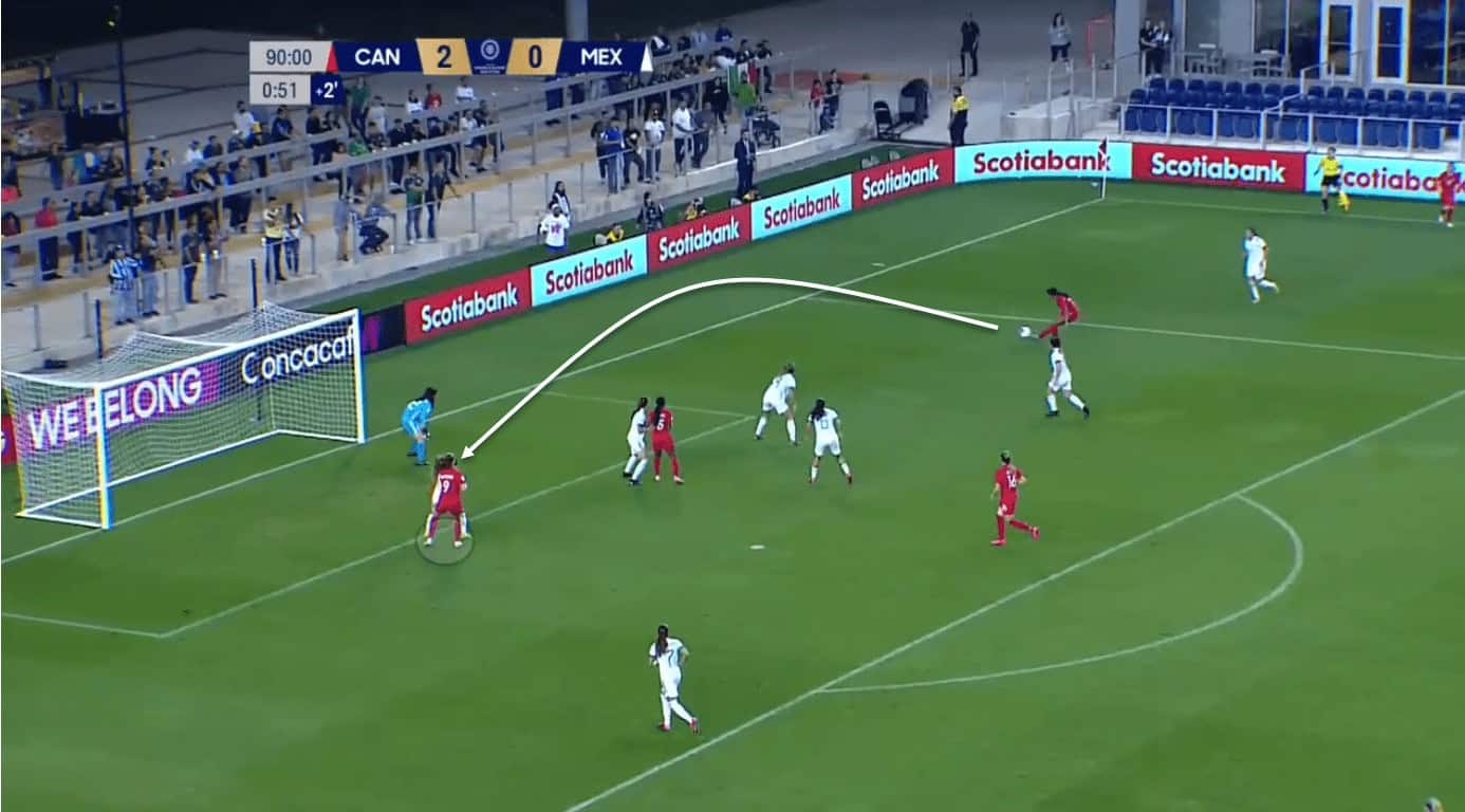 After Canada switch play to the right flank, Lawrence is ready to cross it into the box. Notice Sinclair who is within range of her marker, but times her run to perfection by getting to the back post with just enough acceleration to beat the defender to score from this position. From where she started the move in the first image, to where she ended up is a testament to her tactical intelligence and ability to understand space.