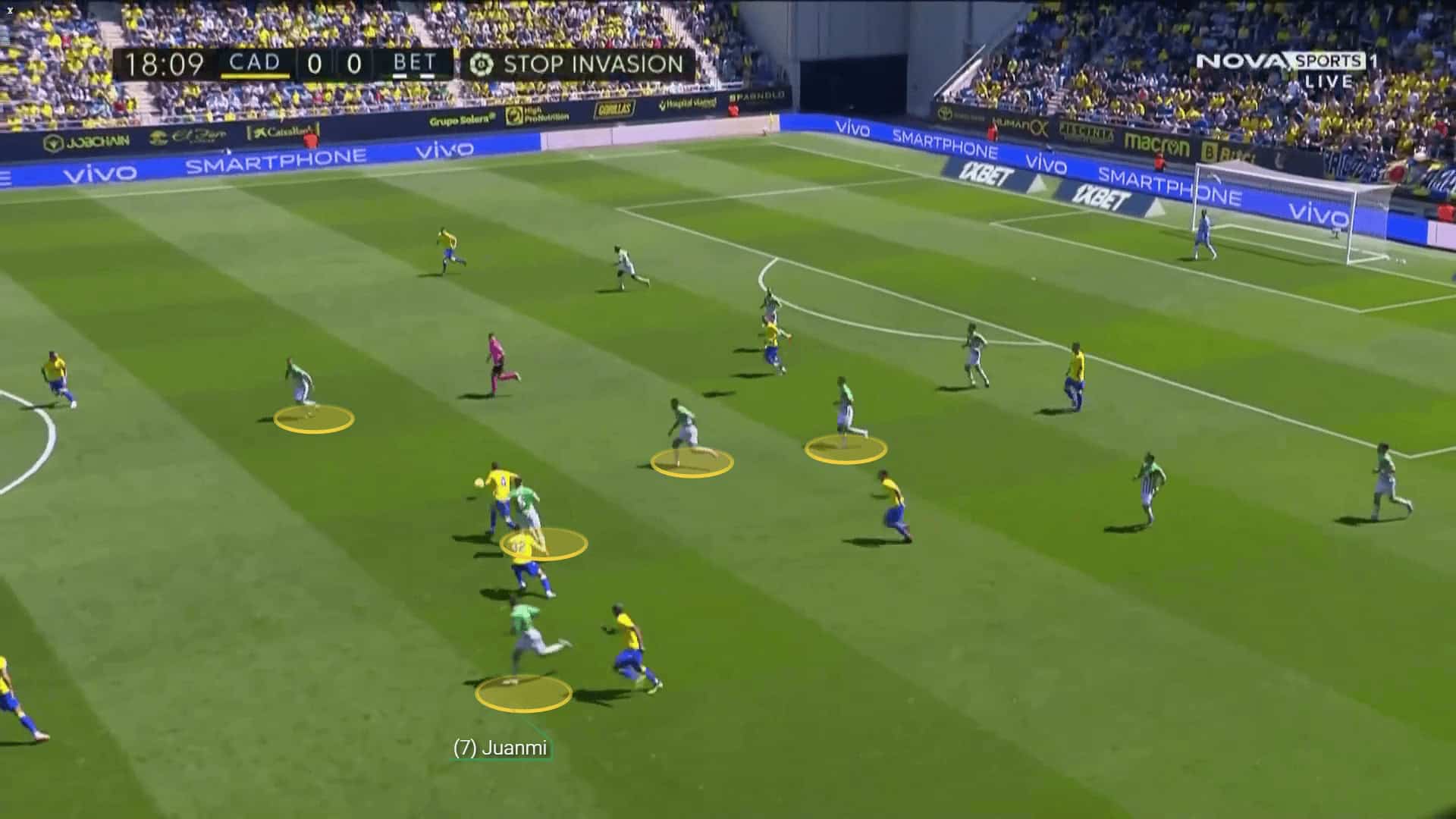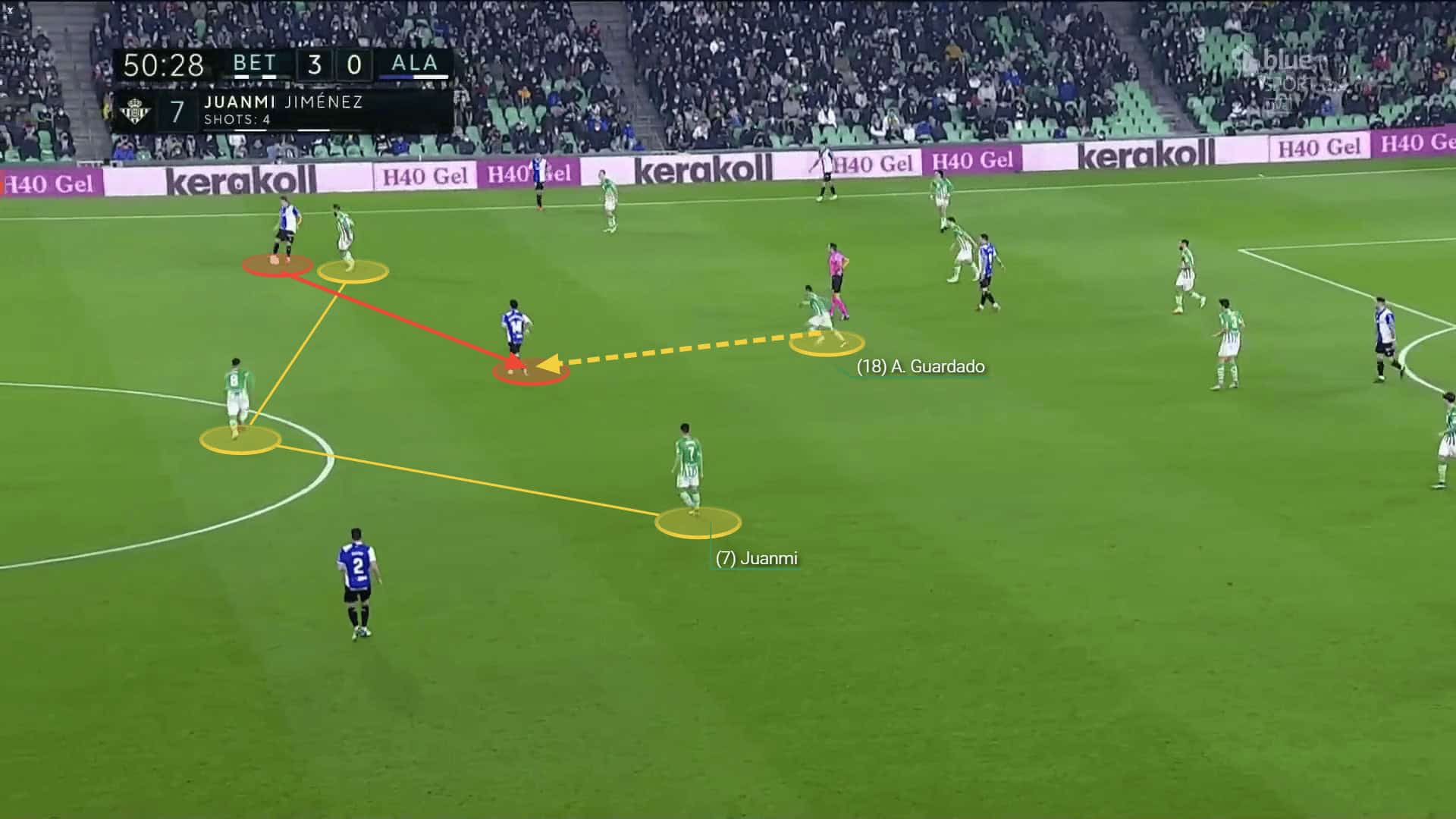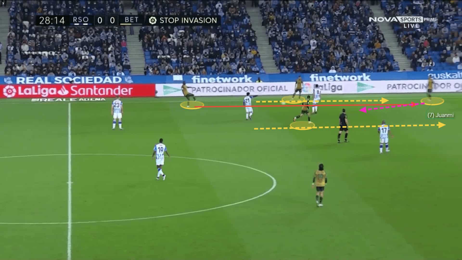 Juanmi’s movement is also key for the team’s counterattacking actions, and he often isolates himself in the advanced areas and is the one who takes responsibility for finishing the attacks and threatening the goal. While his fellow attacker Canales is often the one to start the attacking actions, Juanmi rarely drops that deep to Betis’ box to recover the ball but is more likely to stay on the counter and start his off-the-ball movement early on.