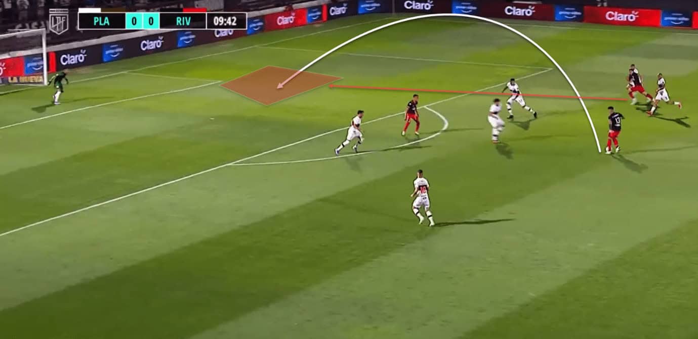 Fernández plays a beautiful, looped ball over the left-sided centre back in the space for Alvarez to attack.