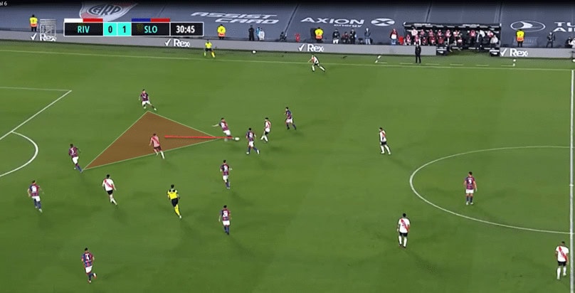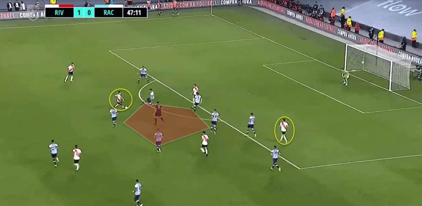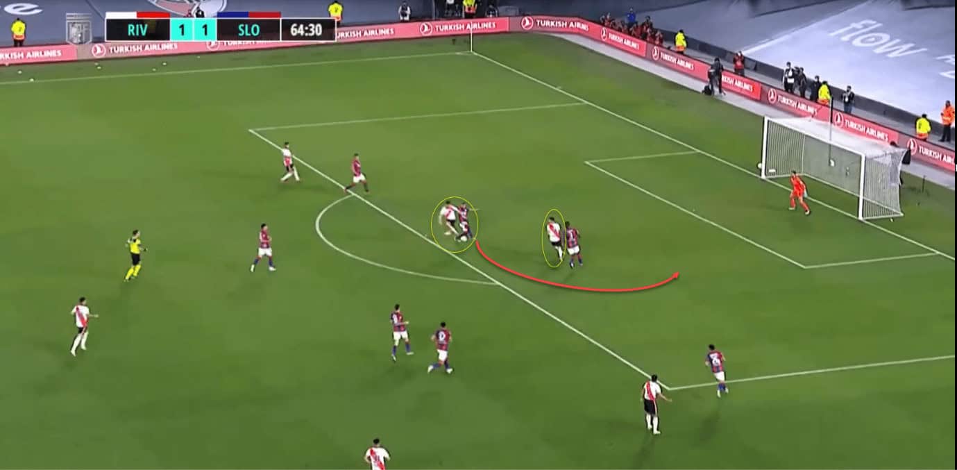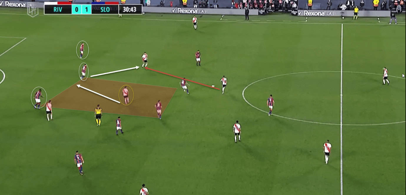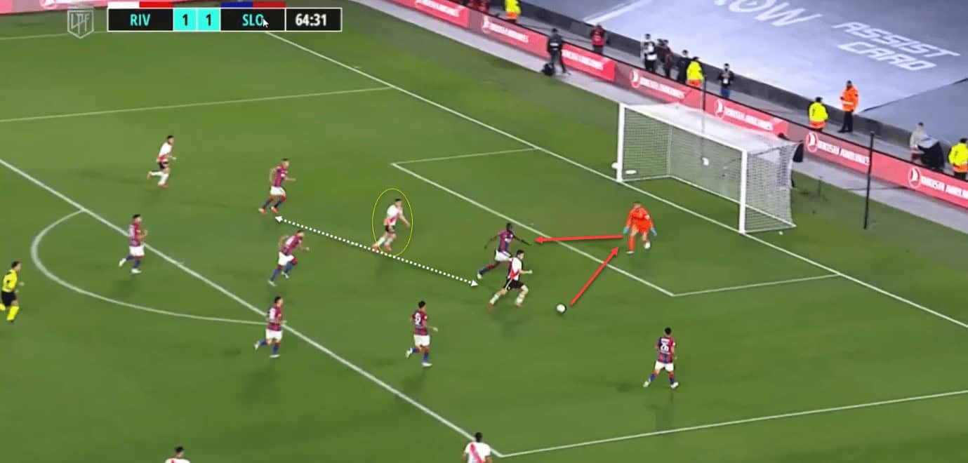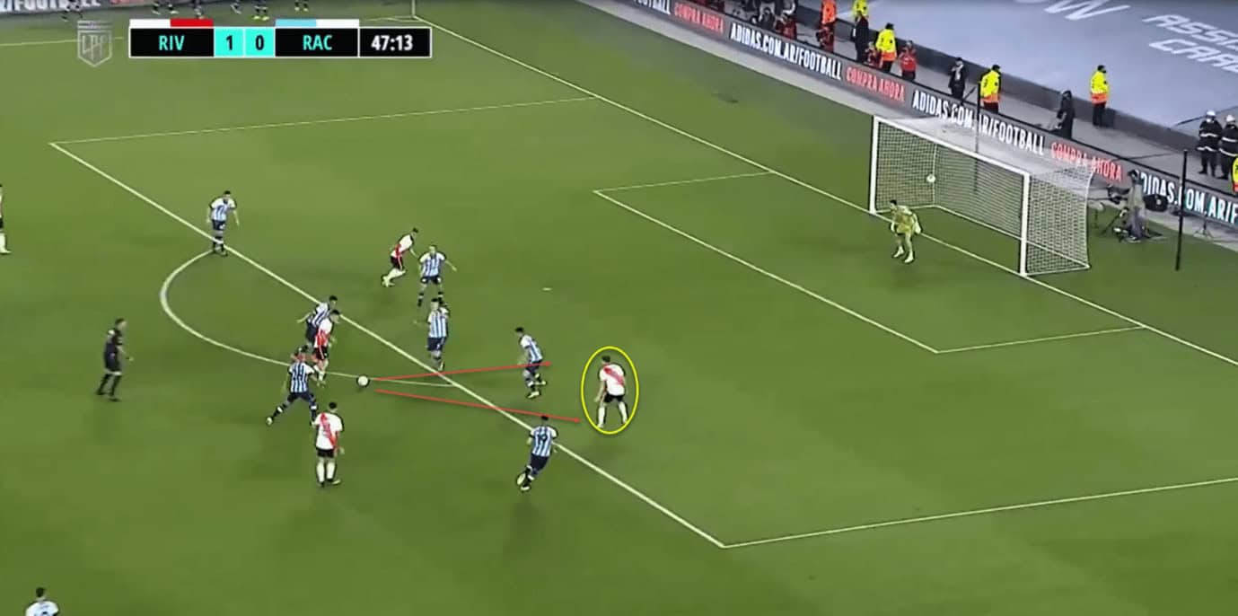 As the ball is played to the River player between the lines, the San Lorenzo left-sided centre back pushes up to engage him, and this creates space for Alvarez to move into and exploit.