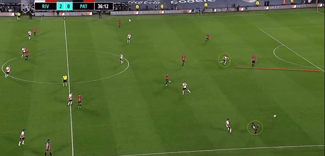 In this example, Alvarez recovers the ball on the right-hand side as he prepares to play a ball to Fernández, who is in acres of space in midfield.