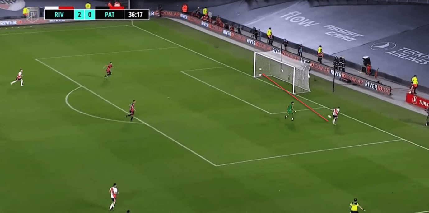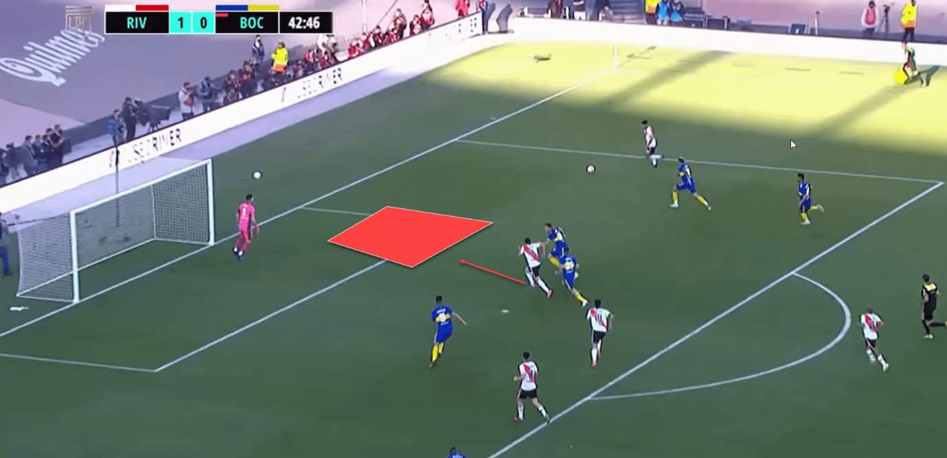 Due to him being well positioned in between the two Boca centre-backs, the left-sided one doesn’t recognize his run until it’s too late.