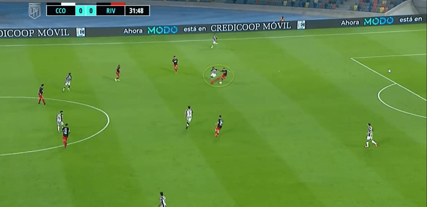 Here, against Central Córdoba, you can see Alvarez pressing the right-sided centre-back.