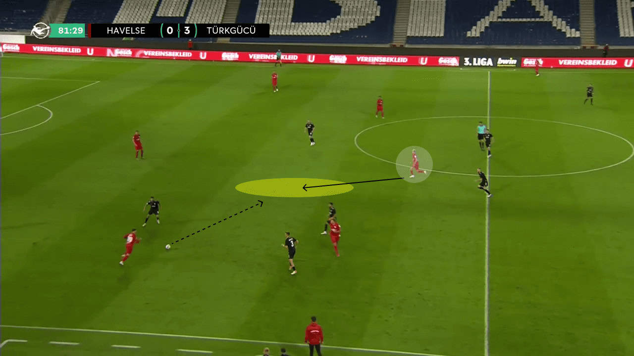 One of the reasons why the coach would prefer either of the defensive midfielders to push up is to outnumber the opponents in the attacking third and also provide more options in the attacking third during the build-up. One of Düker’s roles when playing further upfield is to support and help in the smooth progression of the ball during the initial build-up.
