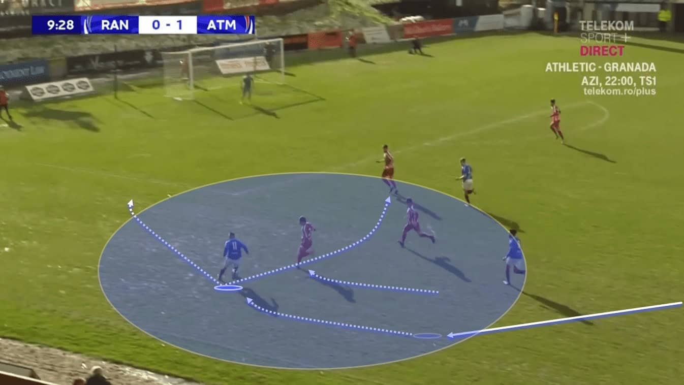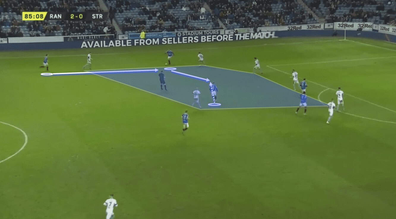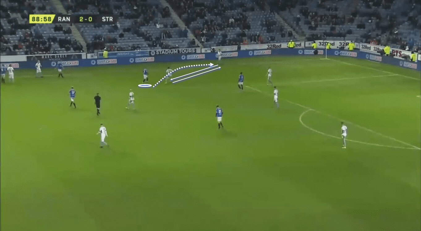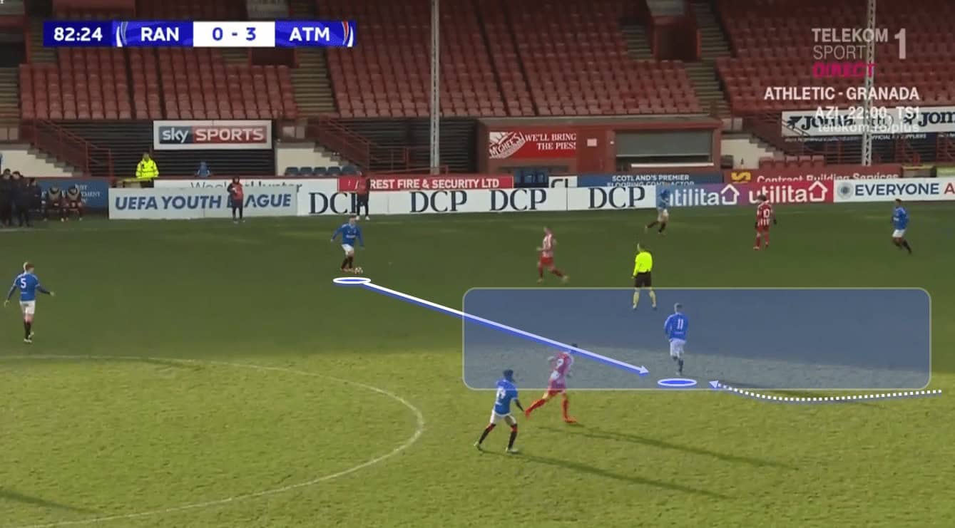 This past season saw Rangers youth side play against Atletico Madrid and it is a clear mark of Kennedy’s quality.that he was not overawed by stepping up a level in terms of quality. In the image above we see a situation with Kennedy driving with the ball down the Spanish side’s left-hand side. He had initially picked the ball up centrally in his own half as Rangers had looked to transition into the attacking phase. He is predominantly right-footed but even in these situations he has the body control and balance to be able to engage and beat defenders down the outside or on the inside.