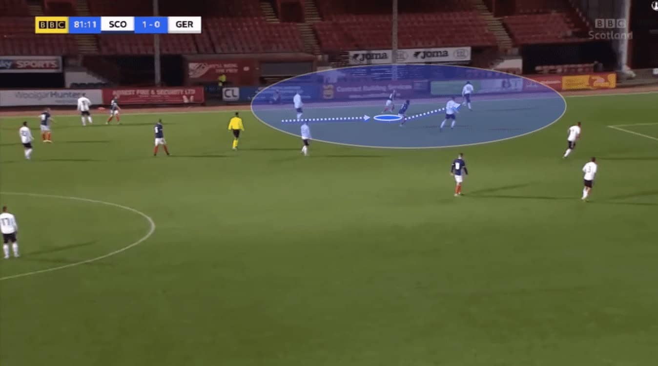 In this instance again we see Kennedy leading the press in order to put pressure on the German defender. The right-back for the Germans has taken a poor touch on receiving the ball and this, in-turn, is a trigger for the press from Kennedy. Such is the explosive nature of the pace that Kennedy possesses he is able to react very quickly to poor touches from opposition players and this can be a key factor in the counter pressing for his team. As he closes the player in possession down the German defender looks to make a pass back to the goalkeeper but Kennedy continues to press and moves towards the opposition player.