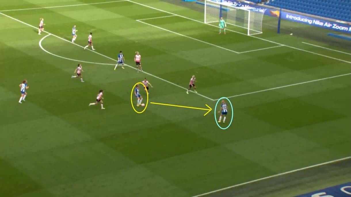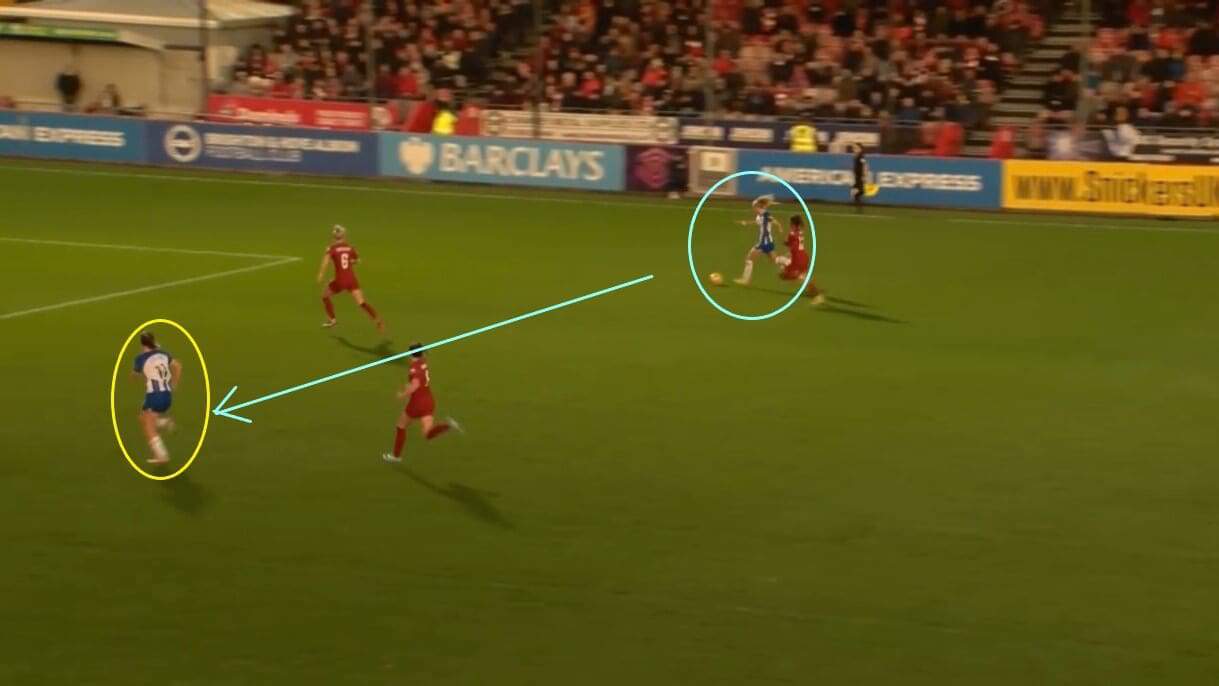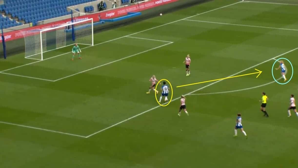 On this occasion, Brighton don’t seem to be on the same wavelength as Robinson and send the ball back towards their own goal area, but the fact that the forward made the run once again shows how she poses a major threat during games and is a player that opposing defences need to be wary of.