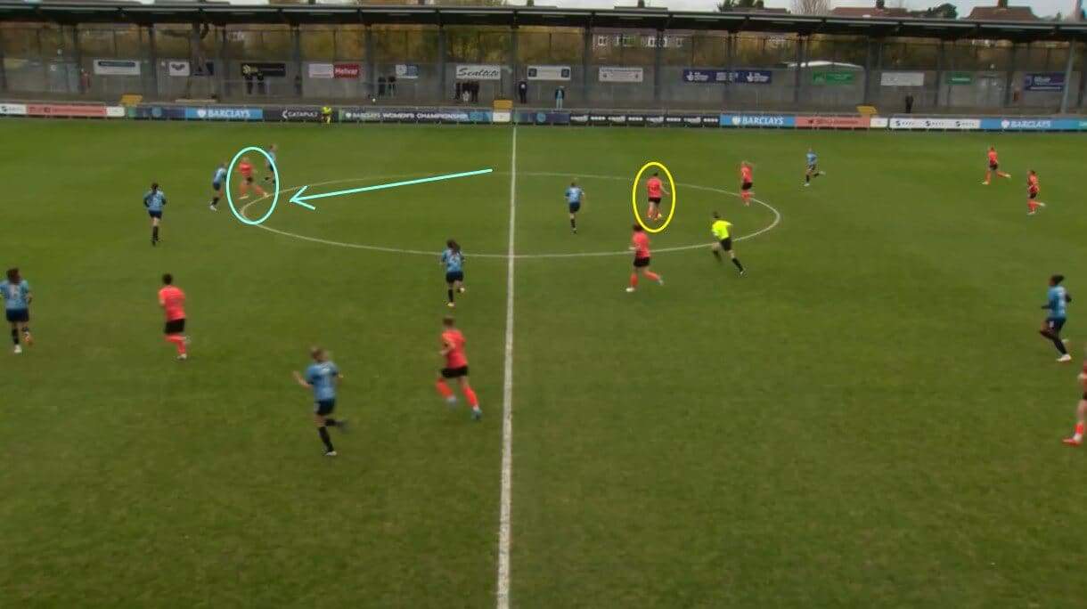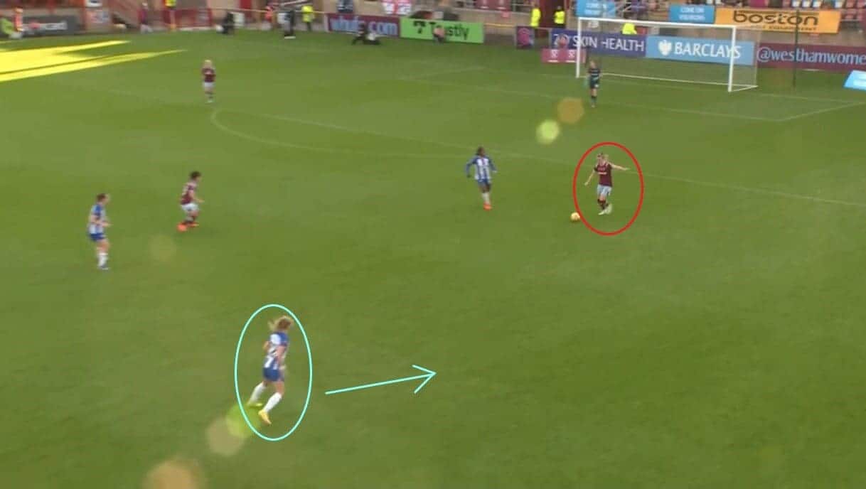 Initially, there was a passing option not too far away from the Wales defender, but Robinson has spotted this and positioned her body so as to cut that option off. As a result, Evans now has no obvious way to pass the ball forwards, with her only options now being to either send it towards the three Brighton players ahead, or to move it back towards her own goal area and look to recycle it.
