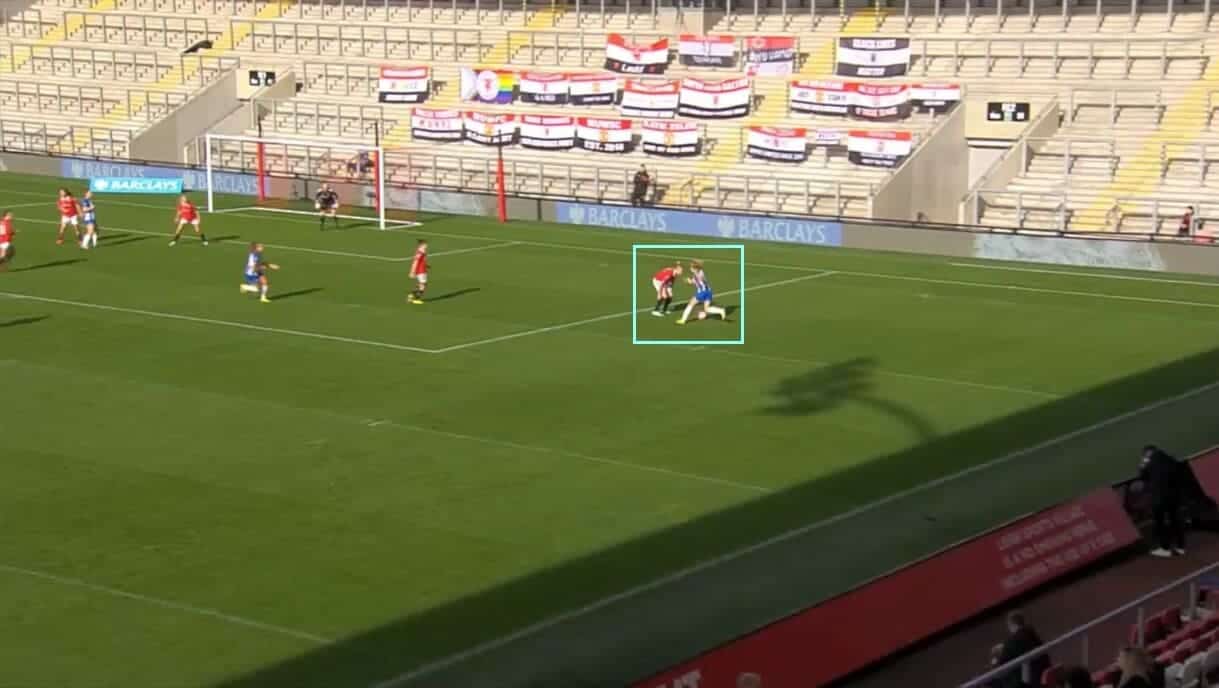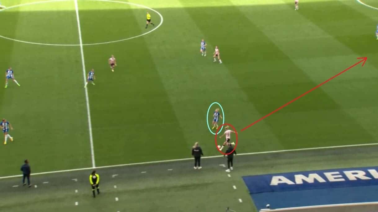 Meanwhile, Robinson has a wide base and a low centre of gravity, meaning that she does have the ability to push off either foot and change direction on the spot, and the fact that she ends up winning this duel easily comes down to little details like that, which show again how Robinson is a dangerous player when given any chance to influence Brighton’s attacking play.