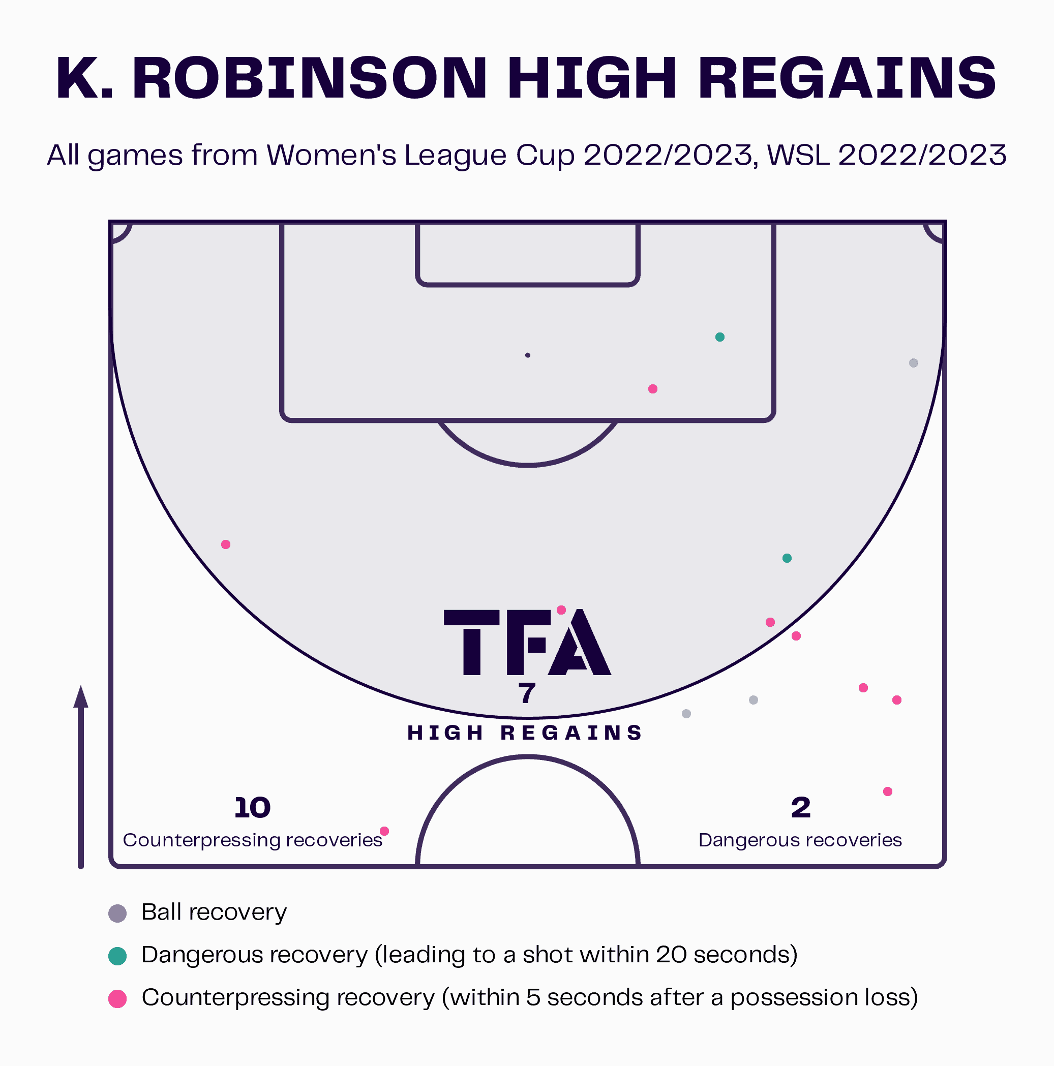 As this graphic indicates, winning the ball in advanced areas is not an uncommon thing for Robinson to do, with her making plenty of high regains during the current season, and this is another reason that she has been a perfect fit for their tactics. Without her securing possession as often as she does (she has made 29 interceptions to date), they would quite simply not pose as big a threat as they do, with many other players not showing the same attacking instinct and ability to time their runs, and that is why, without her, they are a very different team.