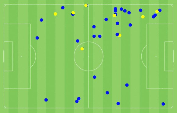 In the map of Kevin’s interceptions (yellow) and defensive duels (blue if successful, red if not), we see two things. Firstly, he works extremely hard in his own half, recovering a lot of balls in what would normally be the full-back zone. Secondly, his intensity to press high and recover the ball in dangerous positions. This makes Kevin a highly adaptable player to any defensive tactics.