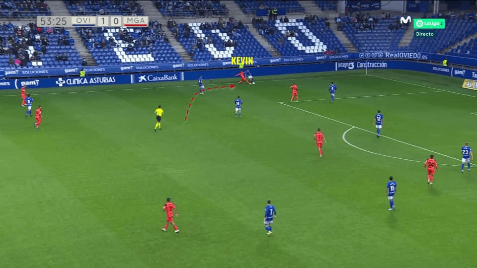 The following picture is a good example of what we’ve explained. As Málaga’s attack reaches a dead end on the right side, Kevin waits wide open on the left side. With a pass backwards and a switch of play, Málaga put Kevin in a 1v1 situation against Oviedo’s right-back.