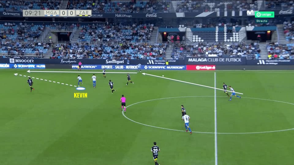 A very common pattern in Málaga’s games is Kevin being wide on the left while the attack progresses through the right side so he’s in a good position to receive an eventual switch of play. If the rival team isn’t very quick to move their defensive line from side to side, he’ll have time to control the ball and have a 1v1 situation with an isolated right-back. Kevin excels in these situations as his dribbling success of 57.14% (top 25% in the league) proves.