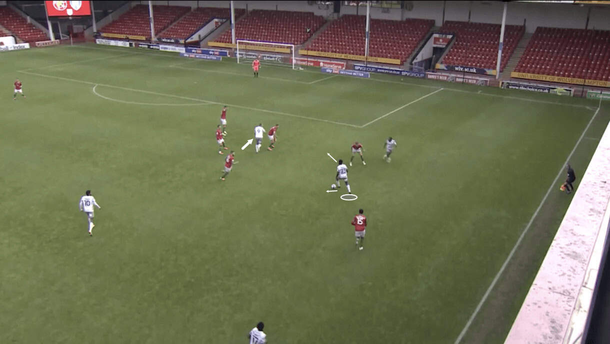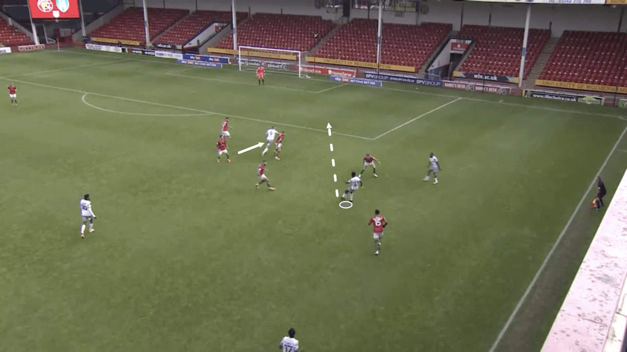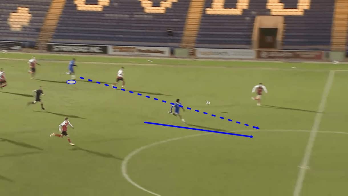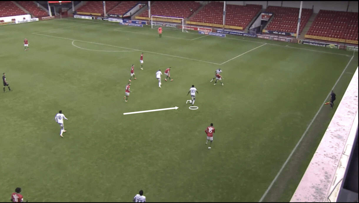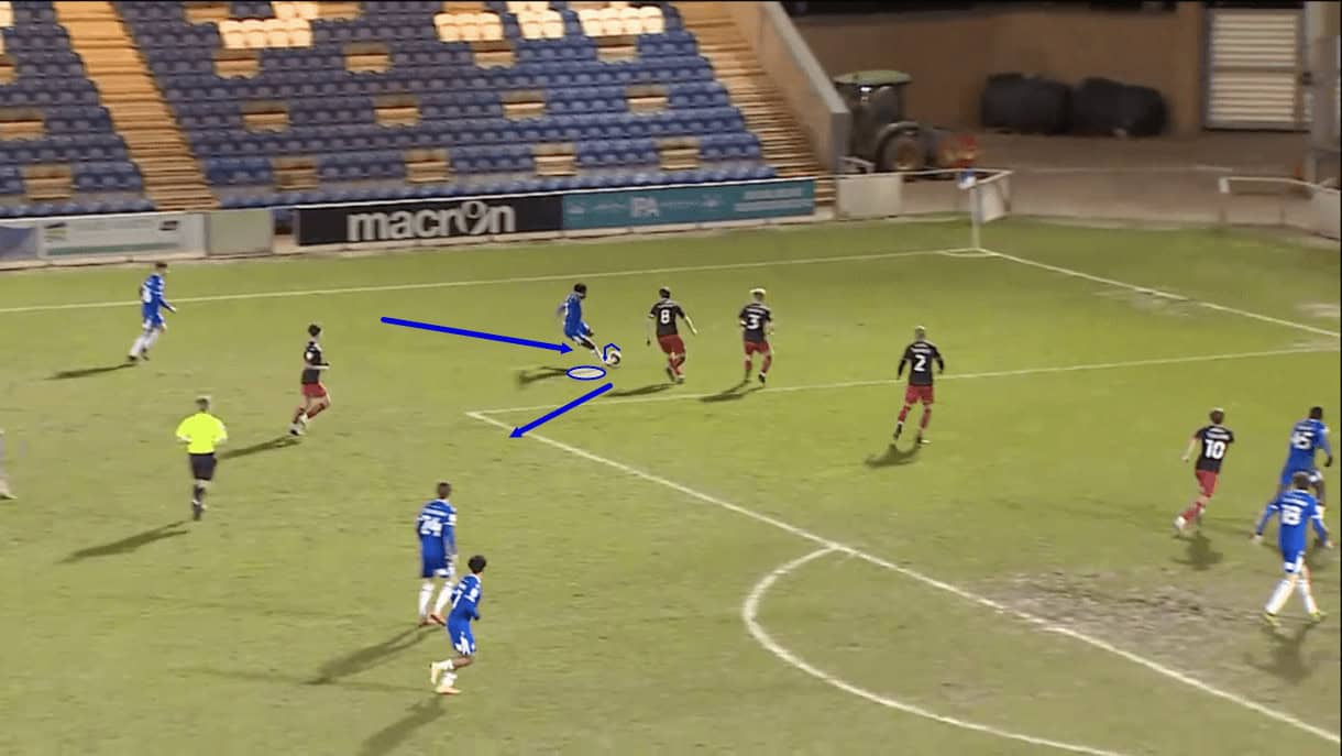 While running onto the through ball, Poku got his head up and spotted a near teammate’s run into space centrally. This is an example of Colchester benefitting from Poku’s impressive awareness of his surroundings. He’s constantly scanning around before receiving possession regardless of where he is on the pitch. A lot of the time, it just seems like Poku is excellent at making good decisions very quickly but his decision-making is undoubtedly helped by his scanning, which is a prominent part of his game.