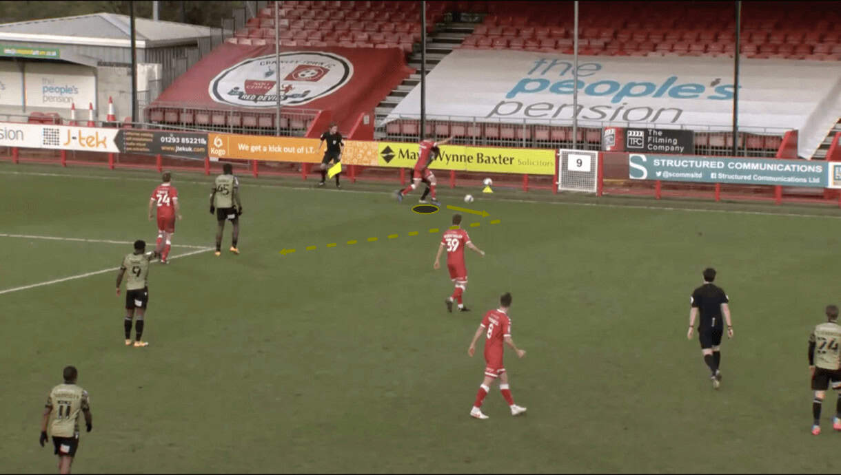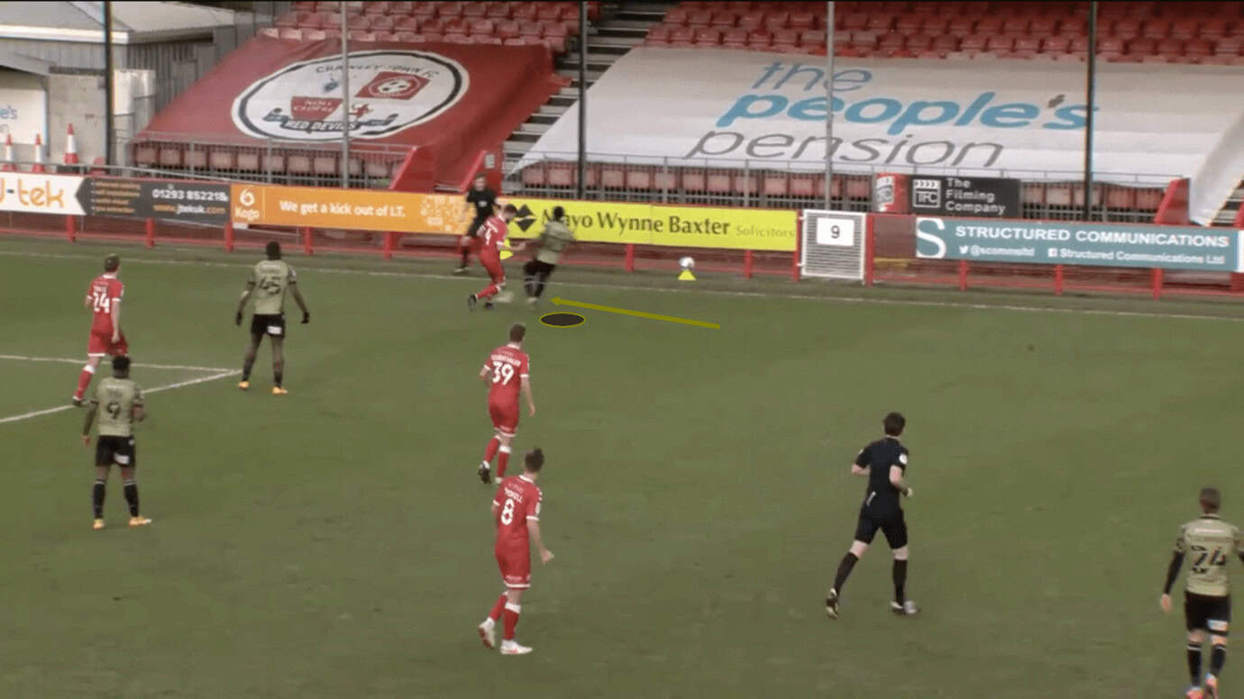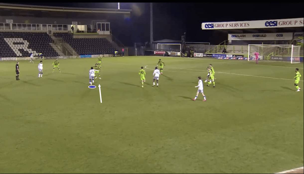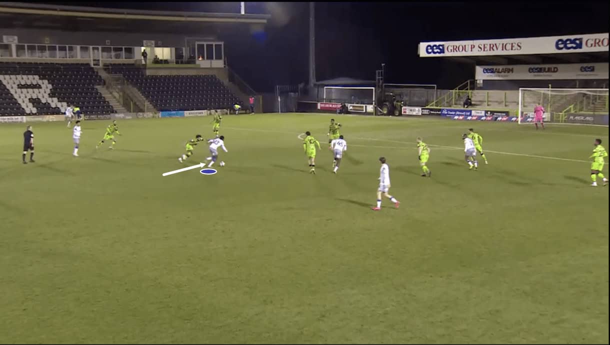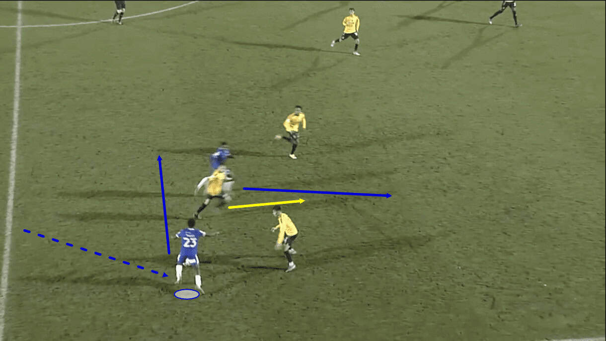 While running onto the through ball, Poku got his head up and spotted a near teammate’s run into space centrally. This is an example of Colchester benefitting from Poku’s impressive awareness of his surroundings. He’s constantly scanning around before receiving possession regardless of where he is on the pitch. A lot of the time, it just seems like Poku is excellent at making good decisions very quickly but his decision-making is undoubtedly helped by his scanning, which is a prominent part of his game.