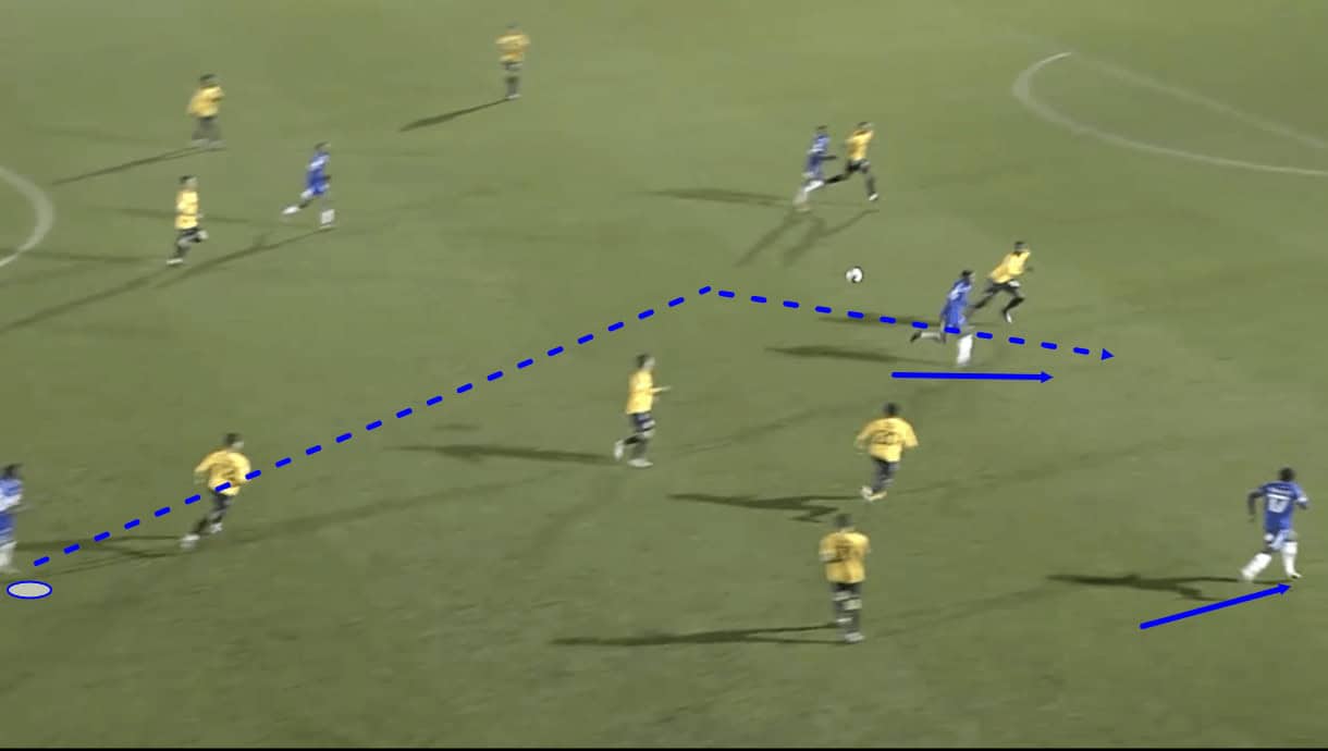 Additionally, figure 11 shows an example of Poku taking advantage of space created in the centre by his teammate’s intelligent, unselfish run. We can see how his teammate ran through, giving Poku an immediate through ball option but also dragging an opposition player away from the space he could to dribble into should that defender block the through pass lane, as he ultimately did.