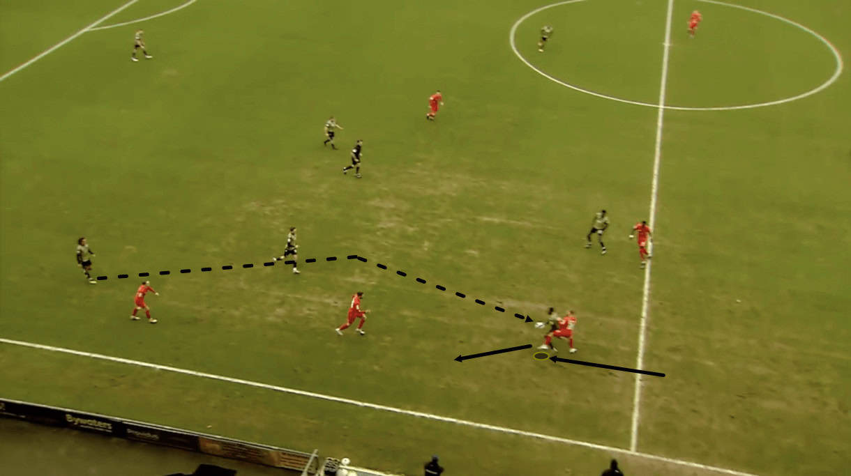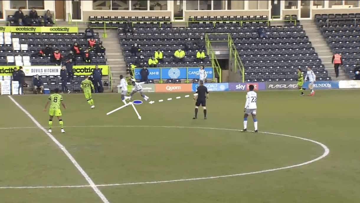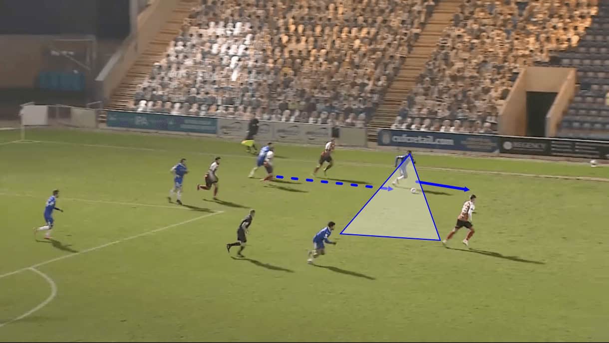 By pulling this off successfully, as he so often does because of how well he disguises the movement, Poku manages to take several opposition players out of the game. It’s a really effective and well-practised movement that we see Poku pull off regularly for Colchester. It can be very difficult to defend against as he doesn’t telegraph it – he’s just great with his feet and great at turning with pace.