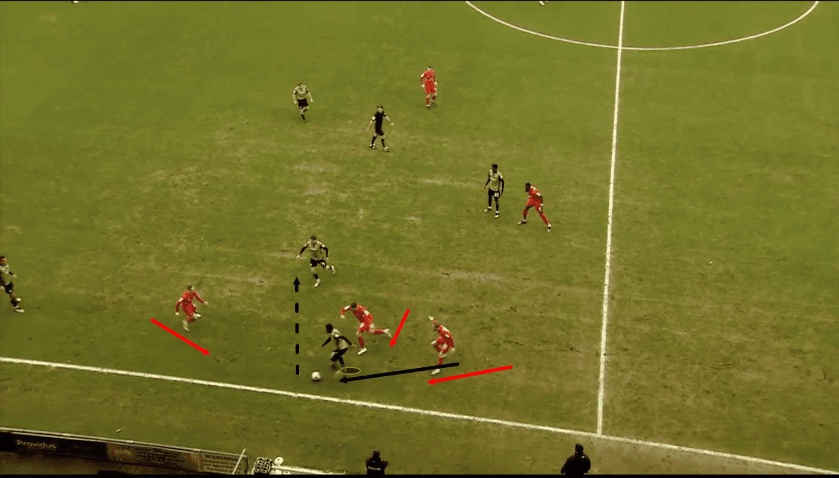 While Poku’s not a giant, he is well built. He’s got strong legs and a strong upper body which he’s comfortable using to back into opposition defenders and hold them off before receiving the ball on the wing or centrally in situations like in figure 4. This, combined with his ball control, dribbling quality, and good awareness of his teammates’ positioning, makes him a very good outlet for holding up the ball.
