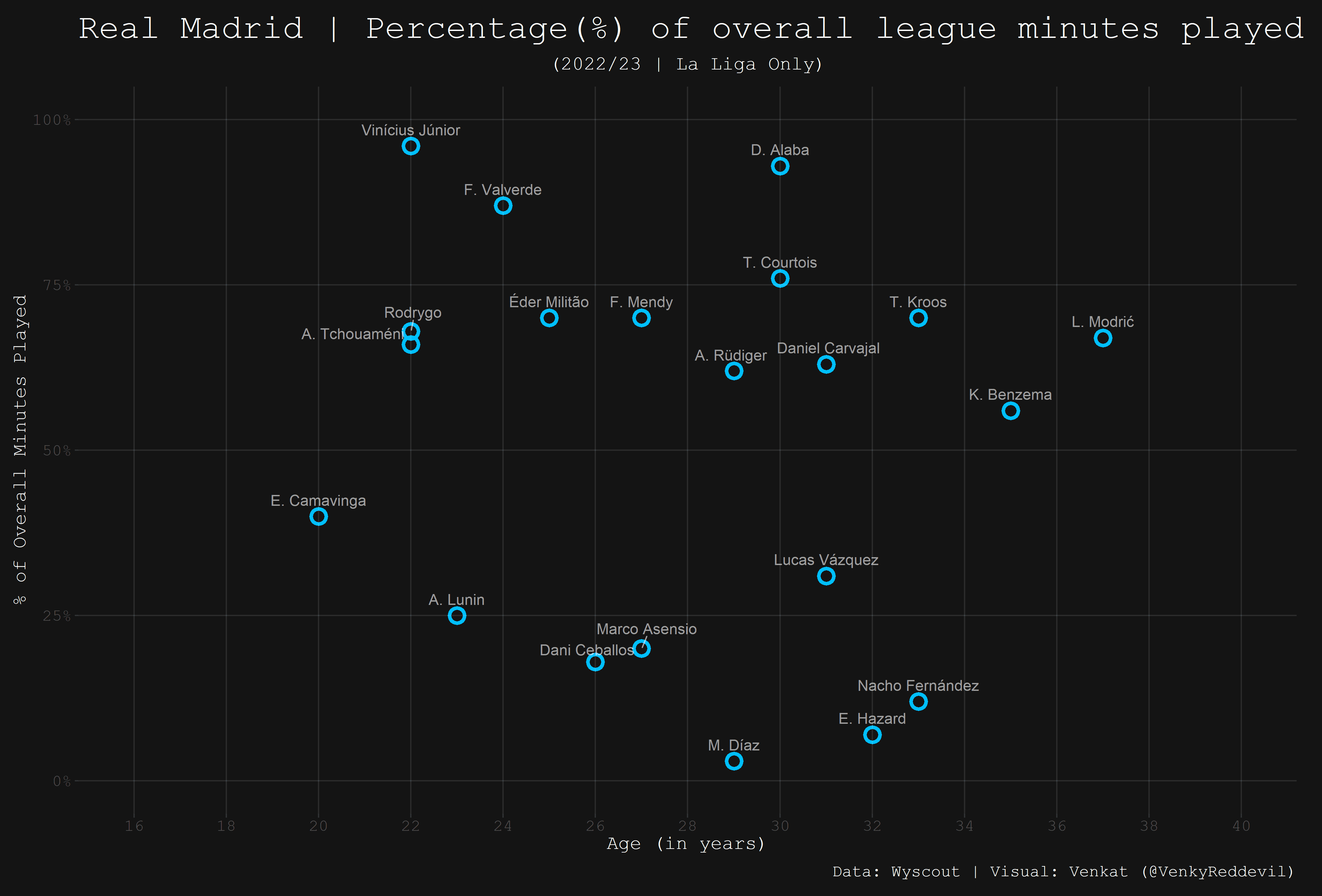 The below visualisation shows the percentage of minutes each of Madrid’s players have played in the 22/23 La Liga season so far.