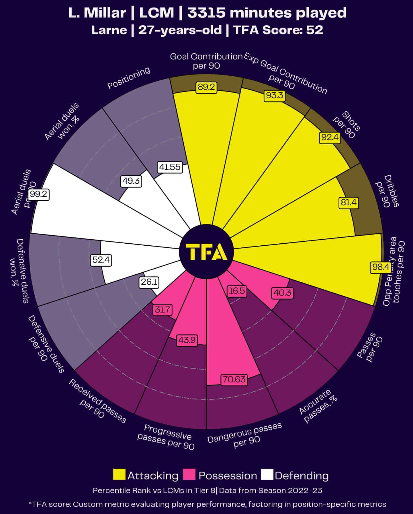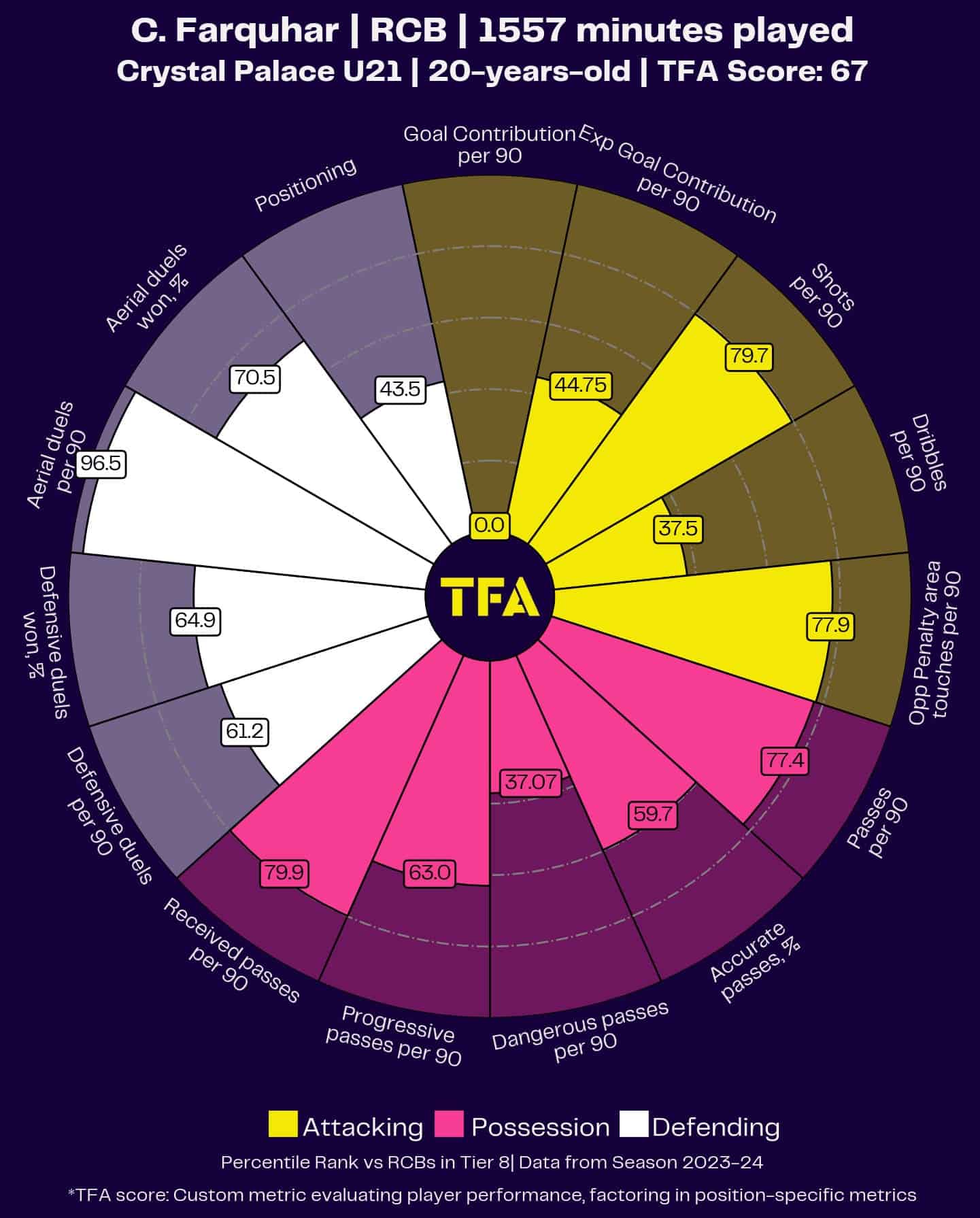 Farquer’s pizza chart shows that the 20-year-old ranked highly in both aerial and defensive duels.