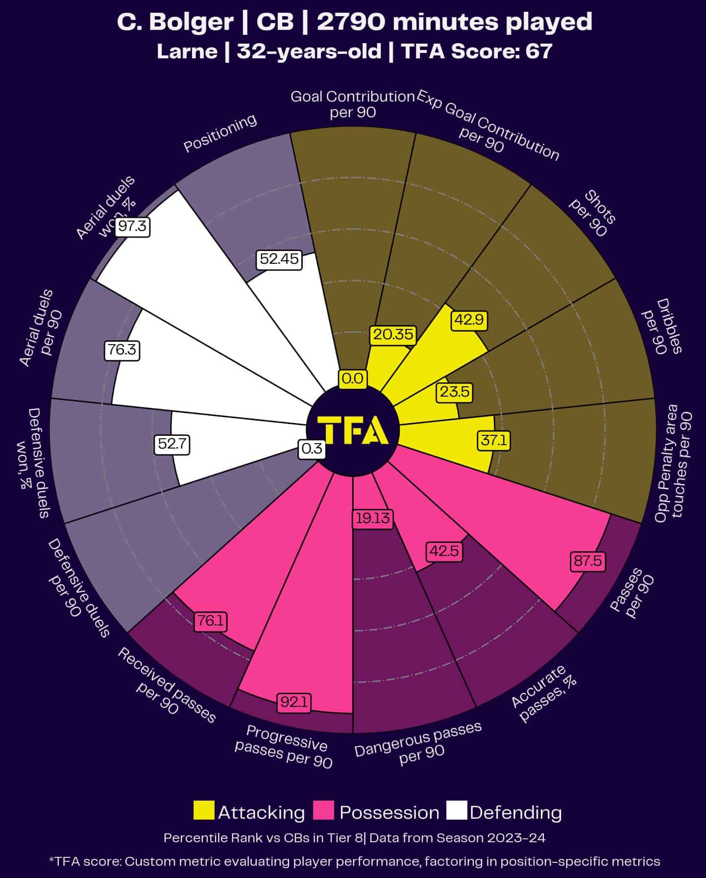 His pizza chart shows that he’s one of the most aerially dominant centre-backs in the league, with an aerial duel win percentage percentile rank of 97.3.