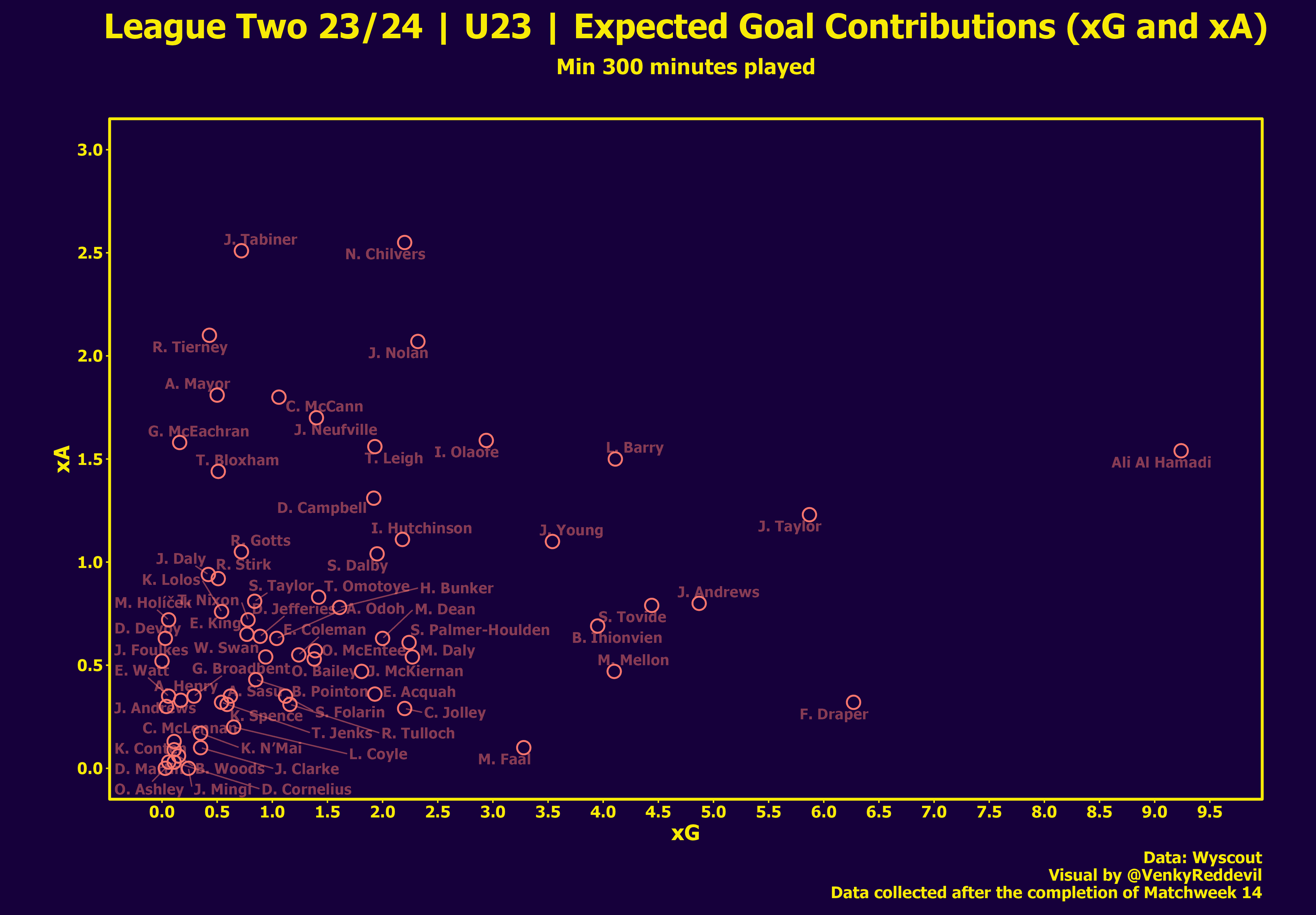 Ali Al Hamadi of AFC Wimbledon has been one of the biggest underperformers of xG, with the 21-year-old centre-forward scoring only four goals from an xG of 9.24. The forward also had three assists to his name from an xA of 1.54. Jake Young, who is the second-highest scorer in the league with nine goals, has done it with a big overperformance in front of the goal, with his goals coming from an xG of just 3.54.