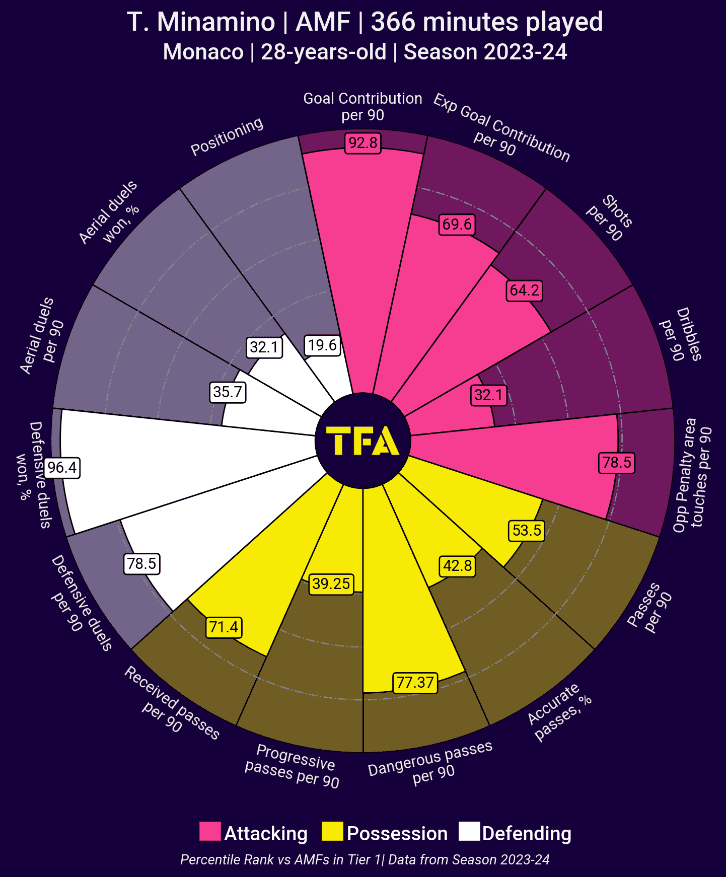 Playing in his most effective role as a no.10 for Les Monégasques, Minamino’s attacking numbers look solid – 2.17 shots per 90 minutes (third highest among attacking midfielders to have played at least 150 minutes), 4.14 touches in the box per 90 minutes (third highest), 0.29 xA per 90 minutes (third highest).