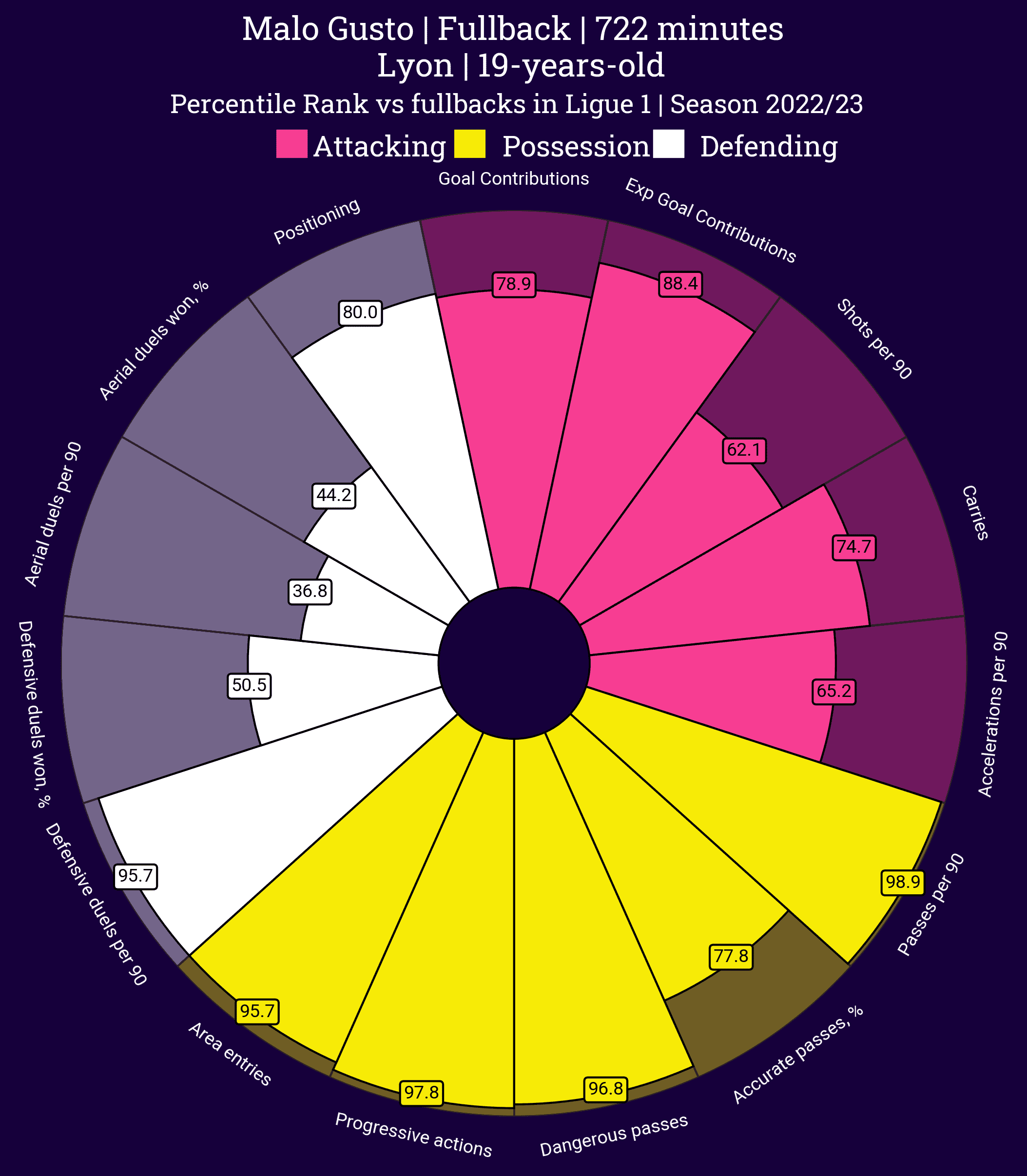 This pizza chart shows Malo Gusto’s data from this season so far compared to all other fullbacks who are playing in Ligue 1.
